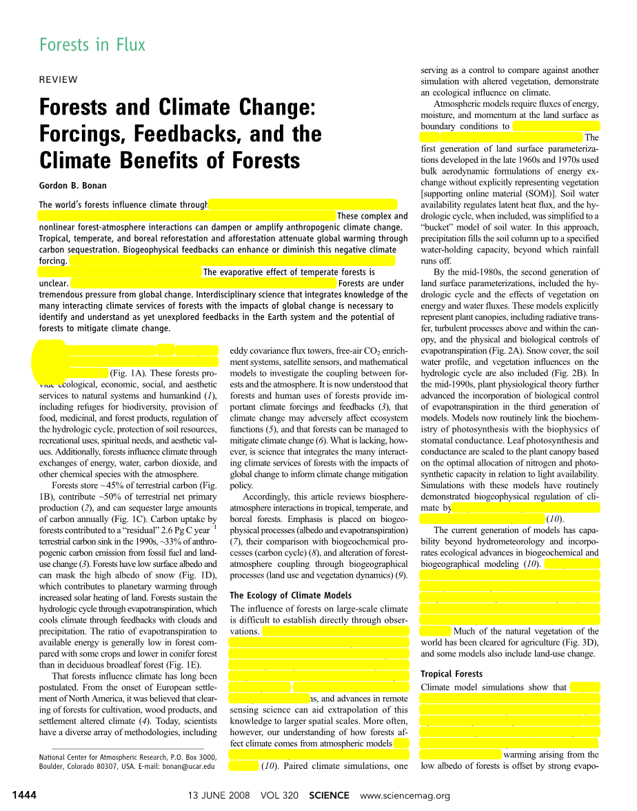 世界森林通过物理、化学和生物过程影响气候,从而影响行星能量、水文循环和大气成分。 森林-大气之间这些复杂且非线性的相互作用可以抑制或放大人为气候变化。热带、温带和寒带造林和再造林通过碳固存减轻全球变暖。生物物理反馈可以增强或减弱这种负面的气候强迫。热带雨林通过蒸发冷却减缓气候变暖,但北方森林的低反照率是一种正的气候强迫。温带森林的蒸发效应尚未明了。来源于这些和其他过程的净气候强迫尚未为人知。森林承受着全球变化的巨大压力。跨学科科学综合了众多相互作用的森林气候服务对全球变化影响的知识,这些知识是识别和理解至今尚未探索和理解的地球系统的反馈机制和森林减缓气候变化潜力所需要的。