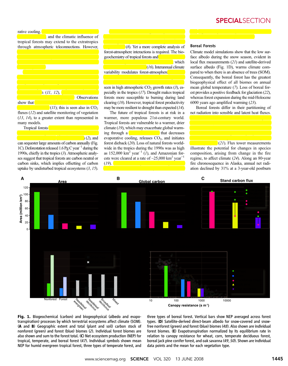 因此,本文阐述了在热带、温带、寒带森林中生物圈和大气的相互作用。重点为生物地球物理过程(反照率和蒸散量)(7)及其与生物地球化学过程(碳循环)的比较(8),还有通过生物地理过程(土地利用和植被动态)产生的森林大气耦合变化(9)。