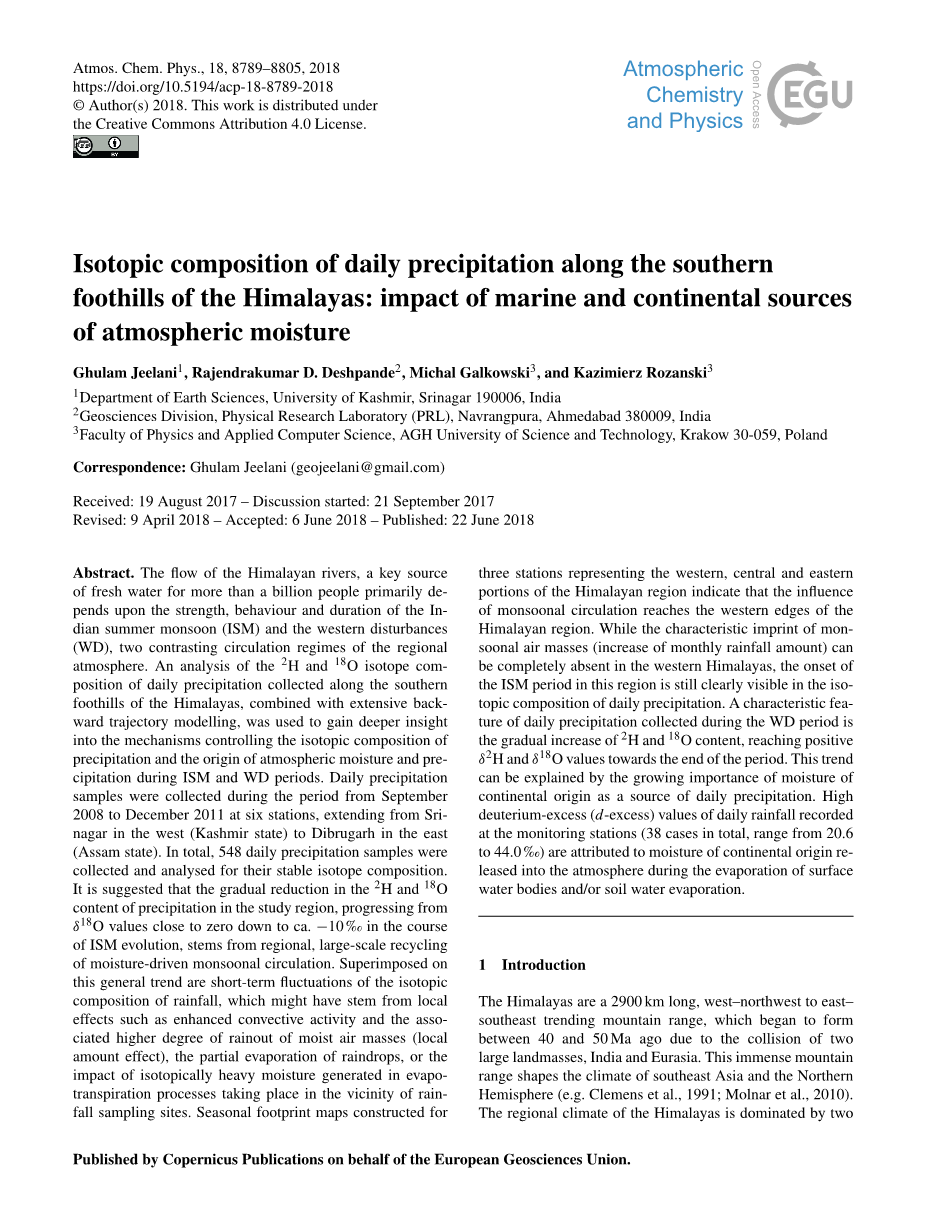题 目 喜马拉雅山南麓日降水的同位素组成:海洋和陆地对大气水汽的影响