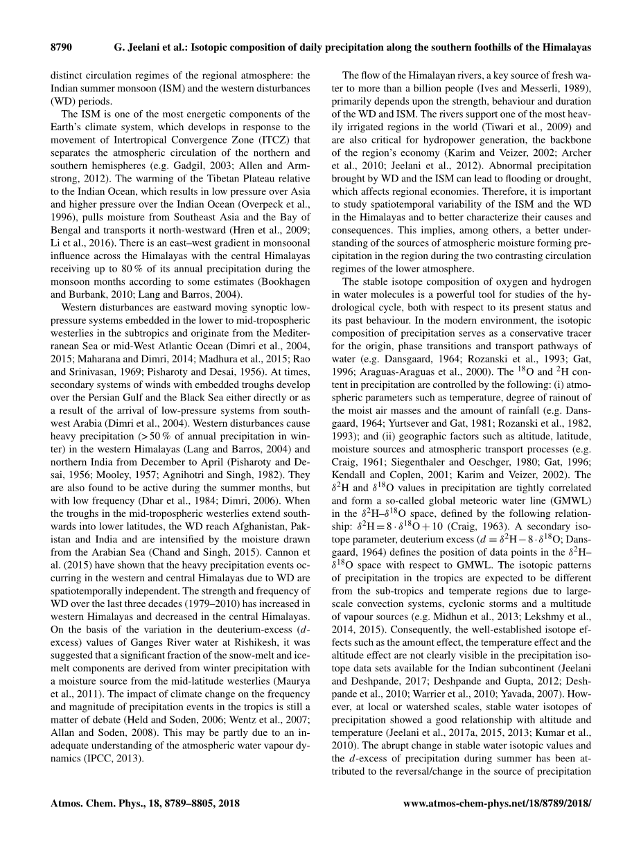 无论是现在还是过去,水分子中氧和氢的稳定同位素组成都是研究水文循环的一种有力工具。在现代环境中,降水的同位素组成为水汽的来源,状态相变和输送途径提供一种合适的示踪剂(例如Dansgaard,1964; Rozanski等)。降水中的18O和2H含量受以下因素的控制:(i)大气参数,例如温度,潮湿气团的降雨程度和降雨量(例如Dansgaard,1964; Yurtsever和Gat,1981; Rozanski等,1982,1993年);ii)地理因素,例如海拔,纬度,水汽源和大气传输过程(例如Criag,1961年; Siegenthaler和Oeschger,1980; Gat,1996年;Kendall和Coplen,2001年; Karim和Veizer,2002)。 降水中的delta;2H和delta;18O值密切相关,在delta;2H-delta;18O之间形成所谓的全球大气降水线(GMWL),由下列关系定义:delta;2H= 8·delta;18O 10(Craig,1963)。 同位素的第二个参数,氘盈余(d =delta;2H-8·delta;18O; Dansgaard,1964)定义了空间中数据点相对于GMWL的位置。由于大尺度对流系统,气旋风暴和大量蒸发,正如所预期的那样,热带地区降水的同位素模式将不同于亚热带和温带地区( 例如 Midhun 等 , 2013; Lekshmy等,2014 ,2015)。因此,在印度次大陆可以获取的降水同位素数据集中,并未清楚地看到已知的同位素效应,如雨量效应,温度效应和海拔效应(Jeelani和Deshpande , 2017; Deshpande 和 Gupta , 2012; Deshpande等人,2010; Warrier等人,2010; Yavada,2007)。然而,在局部或流域尺度上,降水的稳定水同位素与海拔和温度之间呈现一种良好的关系(Jeelani等,2017a,2015,2013; Kumar等,2010)。夏季降水中稳定同位素值和氘盈余的异常改变可以归因于降水源从西风向西南季风的逆转/变化 ( Jeelani 等 , 2017b; Breitenbach等,2010)。