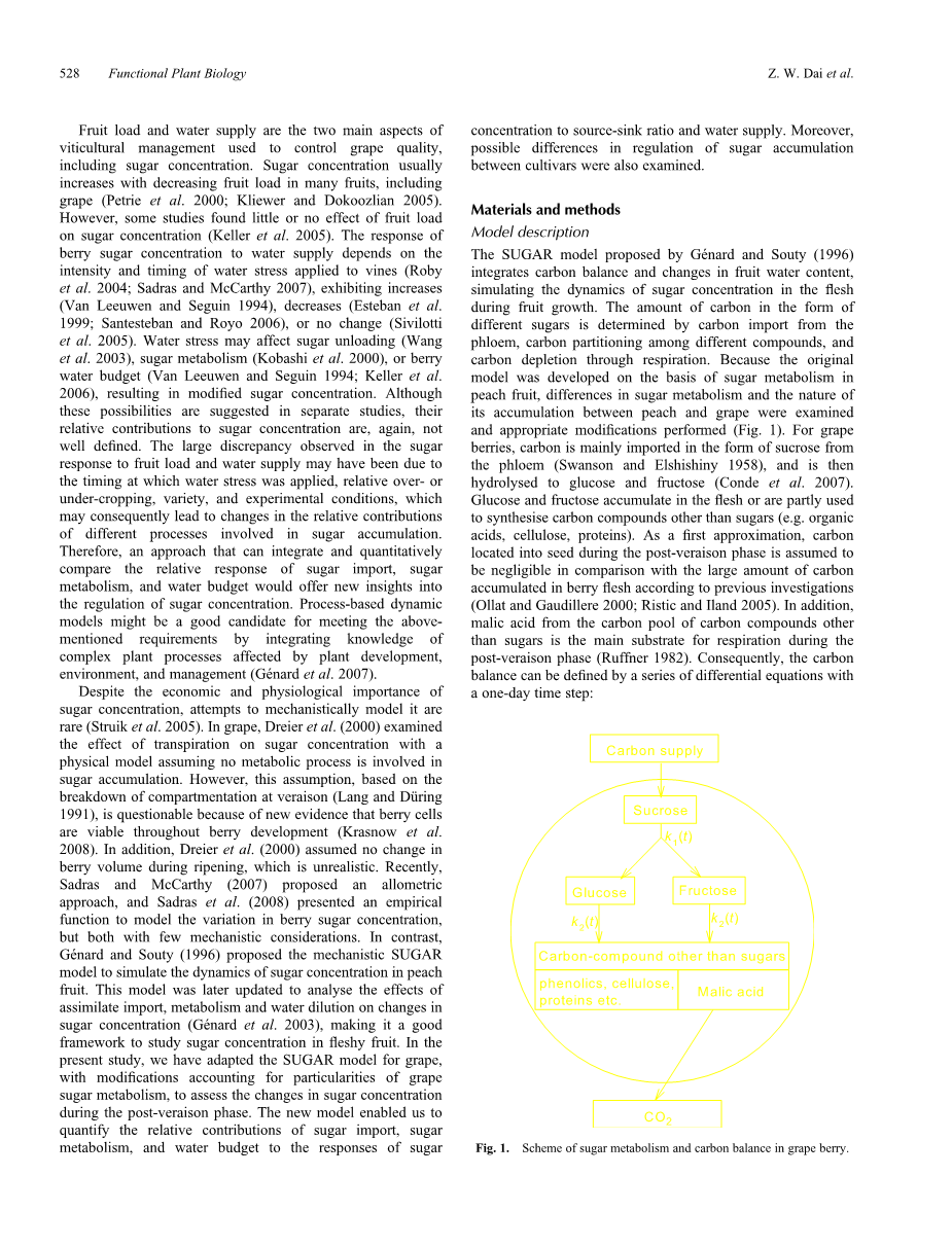 果实负荷和水分供应是葡萄栽培管理的两个主要方面,用于控制葡萄的品质,包括糖浓度。许多水果,包括葡萄,其糖浓度通常随着果实负荷的降低而增加(Petrie et al. 2000; Kliewer and Dokoozlian 2005)。然而,一些研究发现水果负荷对糖浓度的影响很小或没有影响(Keller et al. 2005)。果实糖浓度对供水的响应取决于施加到葡萄上的水分胁迫的强度和时间(Robyet al. 2004; Sadras and McCarthy 2007)的研究结果显示,这一比例呈上升趋势(Van Leeuwen and Seguin 1994),呈下降趋势(Esteban et al. 1999),或者没有变化(Sivilotti et al. 2005)。水分胁迫可能影响糖卸载(Wang et al. 2003)、糖代谢(Kobashi et al. 2000)或浆果水分收支(Van Leeuwen and Seguin 1994;Keller et al. 2006),导致糖浓度发生变化。虽然这些可能性在单独的研究中被提出,但它们对糖浓度的相对贡献仍然没有明确的定义。在果实负荷和水分供应对糖的响应中观察到的巨大差异,可能是由于施用水分胁迫的时间、相对的过熟或欠熟、品种和实验条件,这些因素可能导致糖积累过程中不同过程的相对贡献的变化。因此,一种能够综合和定量比较糖进口、糖代谢和水收支的相对响应的方法将为糖浓度的调节提供新的思路。基于过程的动态模型可能是通过集成受工厂开发、环境和管理影响的复杂工厂过程的知识来满足上述要求(Genard et al. 2007)。