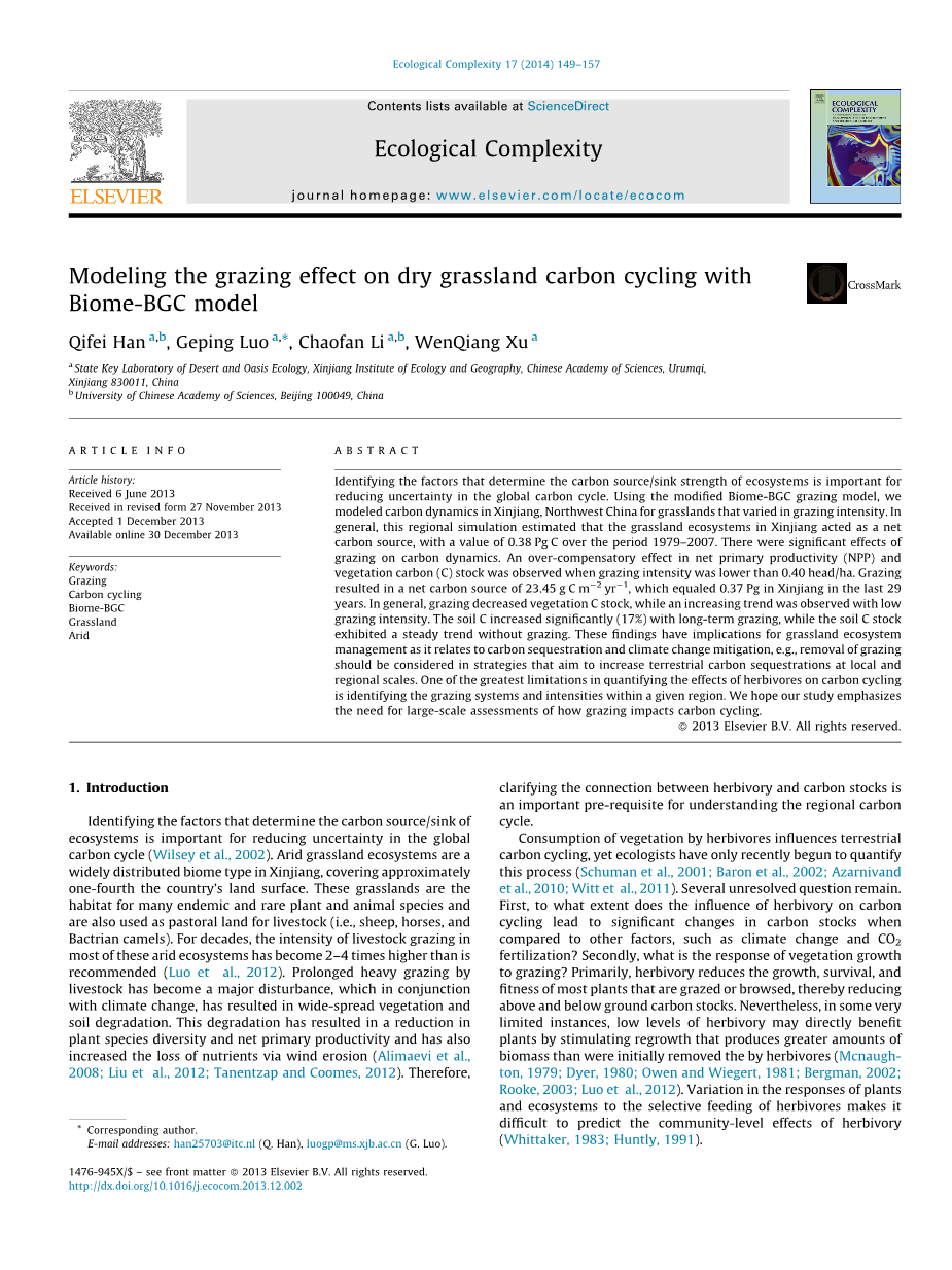 摘要:确定决定生态碳源/汇的驱动力的因素对于减少在全球碳循环的不确定性是很重要的。运用修改的生物地球化学(Biome-BGC)放牧模型,我们模拟了中国西北新疆对于草地的碳动态,该动态会随着放牧的强度而进行改变。通常情况下,这个区域的模拟估算草地在新疆的草地生态系统扮演者净碳源的角色,在1979年到2007年有着3.8亿吨的碳。这是放牧对碳动态十分有意义的影响。当放牧强度低于0.4头每公顷时对发现净初级生产力(NPP)和植被碳储量有超补偿效应。放牧导致一个每平方米每年23.45g碳的净碳源,这等同于在新疆近29年的0.37Pg的碳。通常情况下,放牧会减少碳储量,但也会发现随着低放牧强度下增加的态势。土壤的碳随着长期的放牧显著地增加(17%),而土壤的碳储量在没有放牧的情况下表现出稳定的态势。这些发现对草地生态系统的管理有着深刻意义,正如与碳固定和气象变化迁移(比如,去除放牧应该在政策上得以考虑,这些政策目的在于增加在当地和地区尺度的陆地植被碳固定)有关一样。关于定量化食草动物对碳循环的影响的一个最大的限制就是在给定的地区确定放牧的系统和强度。我们希望我们的研究强调放牧对碳循环的影响程度的大规模尺度的评估的需求。