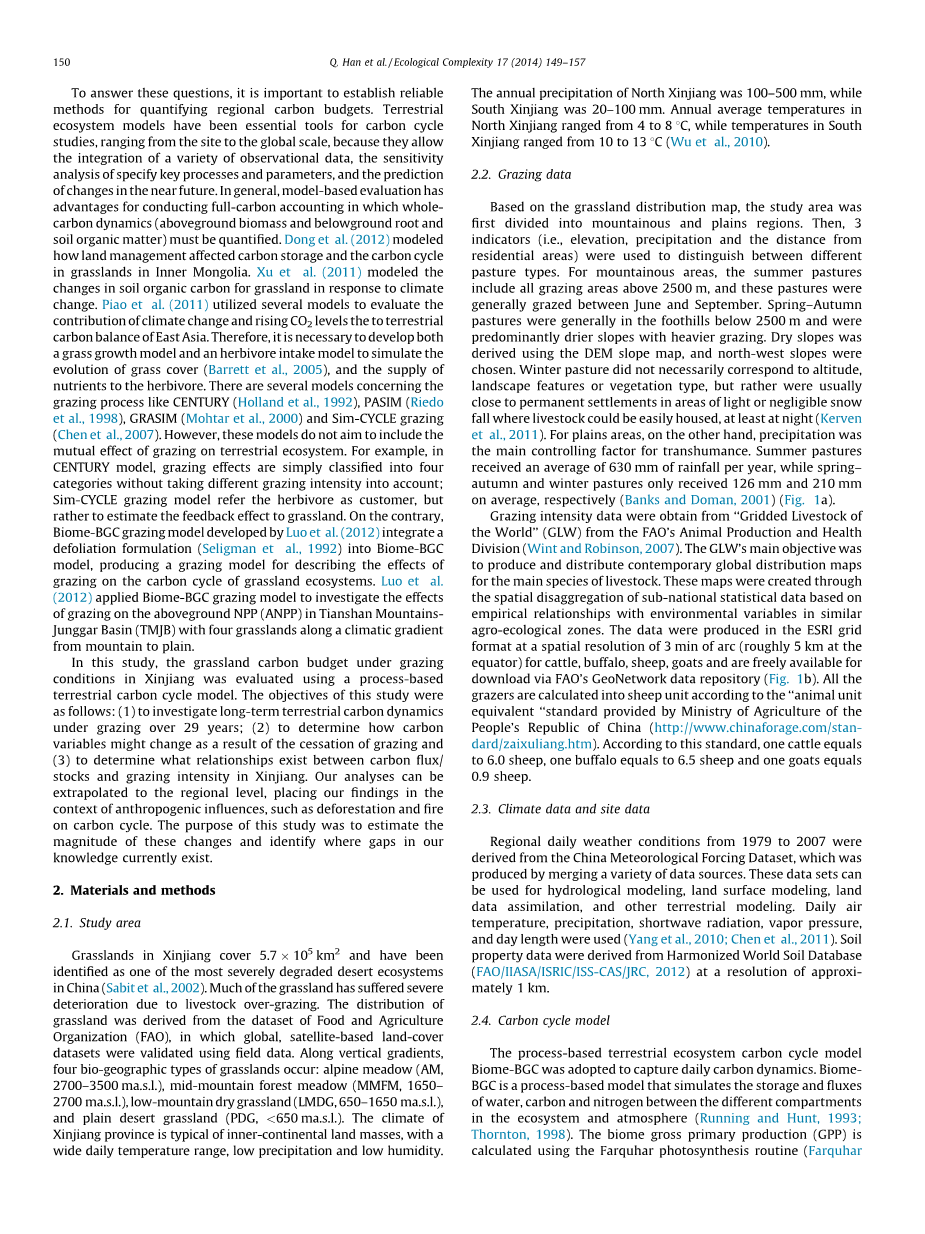 为了回答这些问题,建立可靠的方法来量化区域的碳收支是很重要的。陆地生态系统模型已经成为了研究碳循环重要的工具,范围从区域到全球尺度,因为他们能将一系列已有的数据、特殊又关键过程和参数的敏感性分析和预测未来近期的变化整合在一起。通常下,以模型为基础的评估有着各种的优势,可以在必须要定量化的整个碳动态中(地表生物量和地下根系和土壤有机物)进行全碳的计算。Dong等人(2012)模拟了在内蒙古草地的陆地管理是如何影响碳储量和碳循环。Xu等人(2011)模拟草地土壤有机质的变化对气象变化的反馈。Piao等人(2011)利用多个模型来评估气候变化和上升的二氧化碳等级对东亚陆地碳平衡的贡献。于是,同时发展草生长模型和食草动物摄入模型用来模拟草地覆被(Barrett et al.,2005)的评估,和对食草动物的氮支持。目前有几个关于放牧过程的模型,比如CENTURY(Halland et al.,1992),PASIM(Riedo et al.,1998)GRASIM(Mohtar et al.,2000)和Sim-CYCLE grazing(Chen et al,2007)。然而,这些模型不是旨在用来得出放牧对陆地生态系统的共同影响。比如没在ECNTURY模型中,放牧影响只是很简单地被分成四个类别,没有把不同放牧强度考虑在内;Sim-CYCLE 放牧模型将食草动物作为消费者,但不是用来估计草地的反馈效应。相比之下,由罗格平等人发展得来的Biome-BGC grazing模型将落叶公式(Seligman et al,1992)整合到Biome-BGC模型里,提供了一个用于形容放牧对草地生态系统的影响的放牧模型。罗格平等人(2012)将这个放牧模型用于调查从山地到平原的气象梯度的四个草地类型的天山准噶尔山地盆地地区放牧对地表NPP(ANPP)的影响。