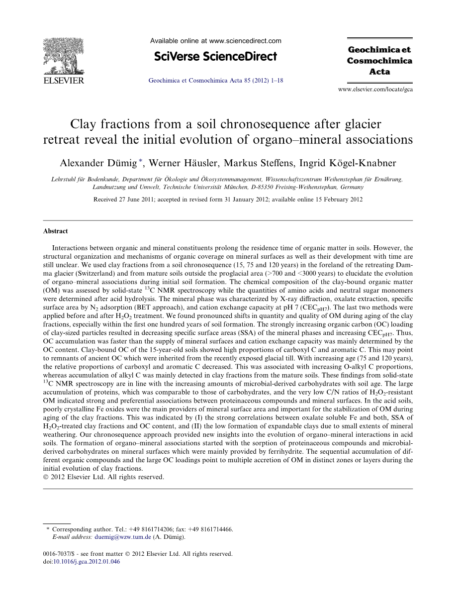 冰川后退形成土壤时间序列中黏粒反演有机-矿物组合体的初始演化外文翻译资料