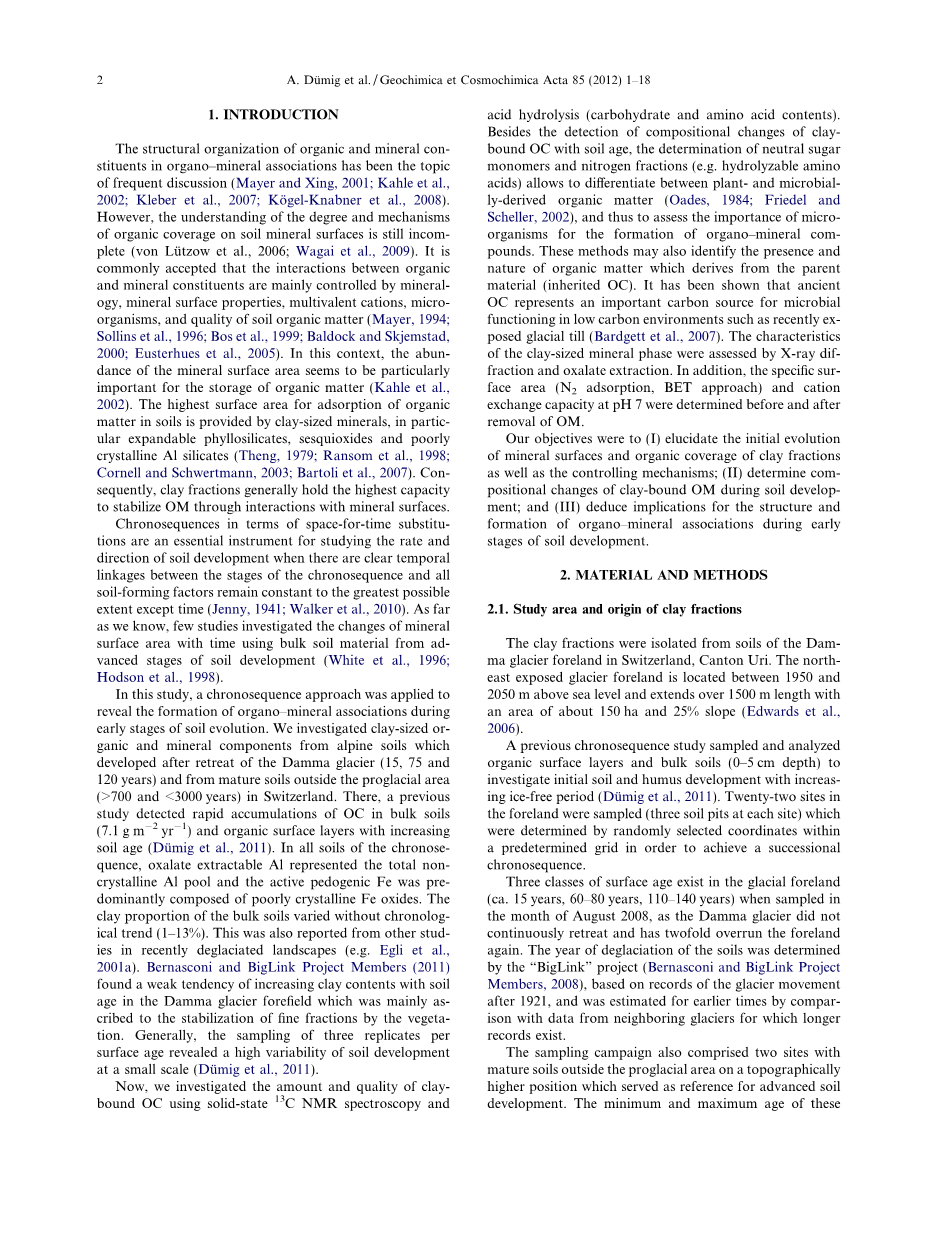 在这项研究中,我们应用时间序列方法揭示土壤演化初期有机矿物组合的形成。我们研究了从Damma冰川(15,75和120年)撤退后的高山土壤以及瑞士冰前地区以外成熟土壤中黏土大小的有机矿物组分。在此之前,以前的一项研究检测到随着成土年龄的增加,大部分土壤中OC(7.1克/平方米/年)和有机表面层迅速积(Dumig et al., 2011)。在时间序列的所有土壤中,草酸可萃取的Al代表总非晶态Al池,成土活性Fe主要由不完全结晶的Fe氧化物组成。大部分土壤的黏土比例不因时间推移而改变,这是最近其他一些研究中反映出来的 (e.g. Egli et al.,2001a).伯纳斯科尼和BigLink项目成员(2011)发现,在Damma冰川前期,随着成土年龄的增加,黏土含量增加的趋势很弱,这主要归因于植被的固定分数。一般来说,每个表面年龄三次重复的抽样显示出了小规模土壤发育的高变异性(Dumig et al., 2011)。