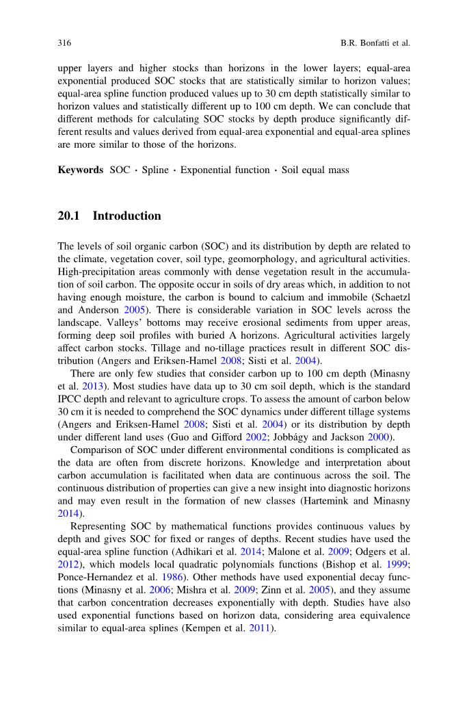 通过数学函数表示SOC提供了深度的连续值,并为固定或深度范围提供了SOC。最近的研究使用了等地面样条函数(Adhikari 2014; Malone 2009; Odgers 2012),其模拟局部二次多项式函数(Bishop 1999;Ponce-Hernandez 1986)。其他方法使用指数衰减函数(Minasny等 2006; Mishra等 2009; Zinn等 2005),他们假定碳浓度随深度呈指数下降。研究也有使用基于层数据的指数函数,考虑区域等价类似于等面积样条(Kempen等 2011)