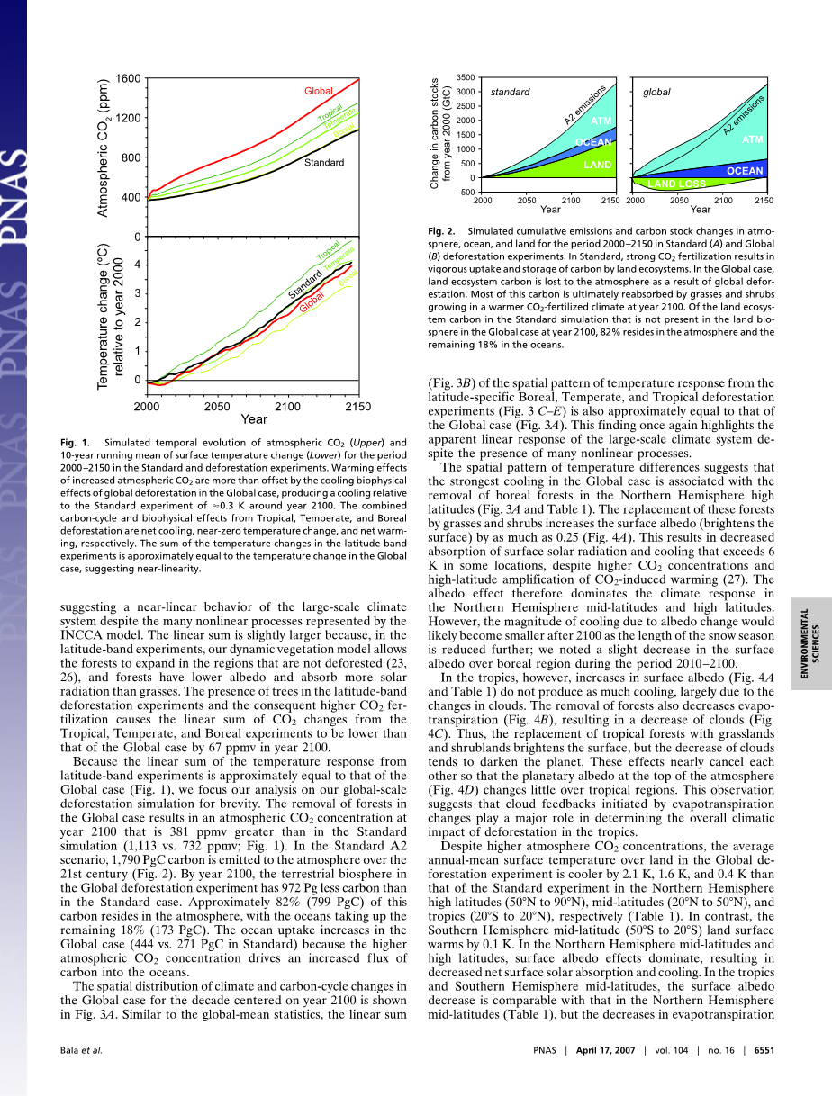 相对于标准情况,热带,温带和北方地区的大气CO 2浓度高出299,110和5 ppmv。热带,温带和北方实验中相对于2100年标准情况的全球平均温差分别为 0.7 K,-0.04 K和-0.8 K(图1)),暗示热带,温带和北方森林砍伐的碳循环和生物物理效应分别为净变暖