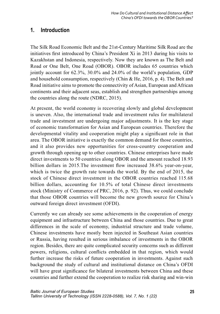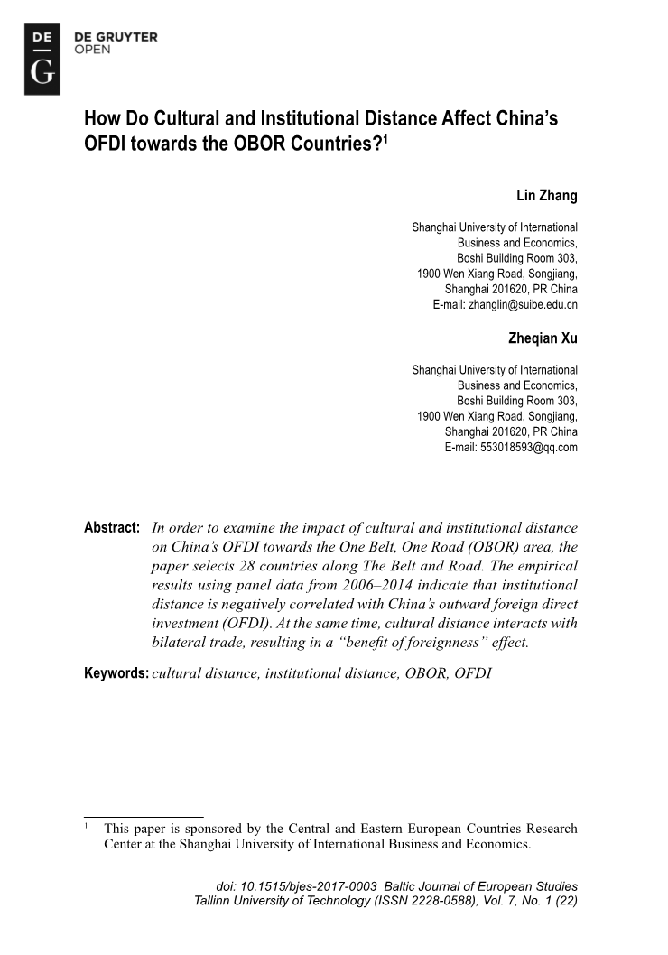摘要:为了检验文化和制度距离的影响关于中国对一带一路(OBOR)地区的对外直接投资问题论文选择了“一带一路”沿线的28个国家。 实证结果使用2006 - 2014年的面板数据表明制度距离与中国的对外直接负相关投资(OFDI)。 与此同时,文化距离与之相互作用双边贸易,产生了“利益外”的影响。