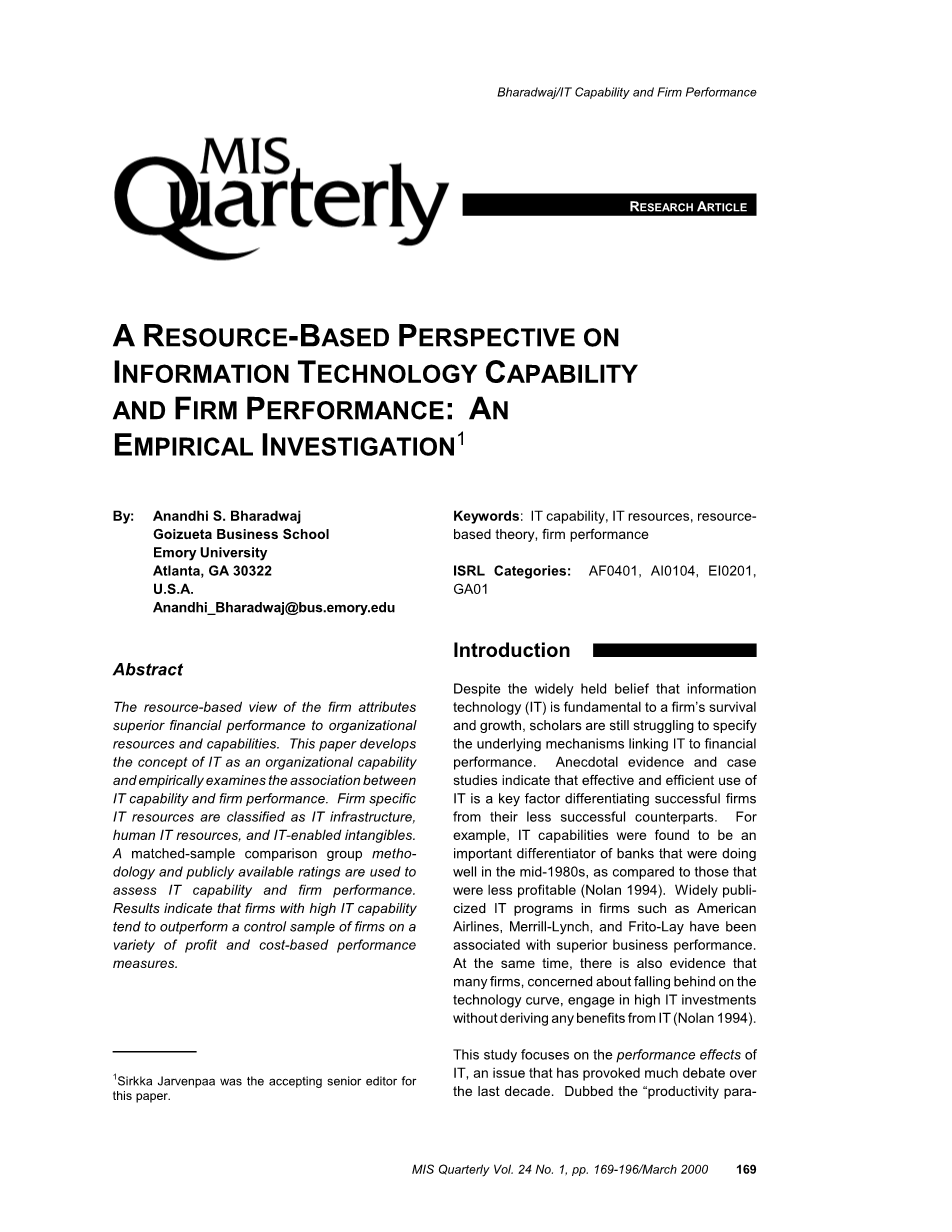摘要:基于资源的公司视图将卓越的财务绩效归因于组织资源和能力。本文将IT概念作为一种组织能力进行开发,并根据经验检验IT能力与公司绩效之间的关联。固定的特定IT资源分为IT基础架构、人力IT资源和IT支持的无形资产。匹配样本比较组方法和公开评级用于评估IT能力和公司绩效。结果表明,具有高IT能力的公司倾向于在各种基于利润和成本的绩效指标上超越公司的控制样本。