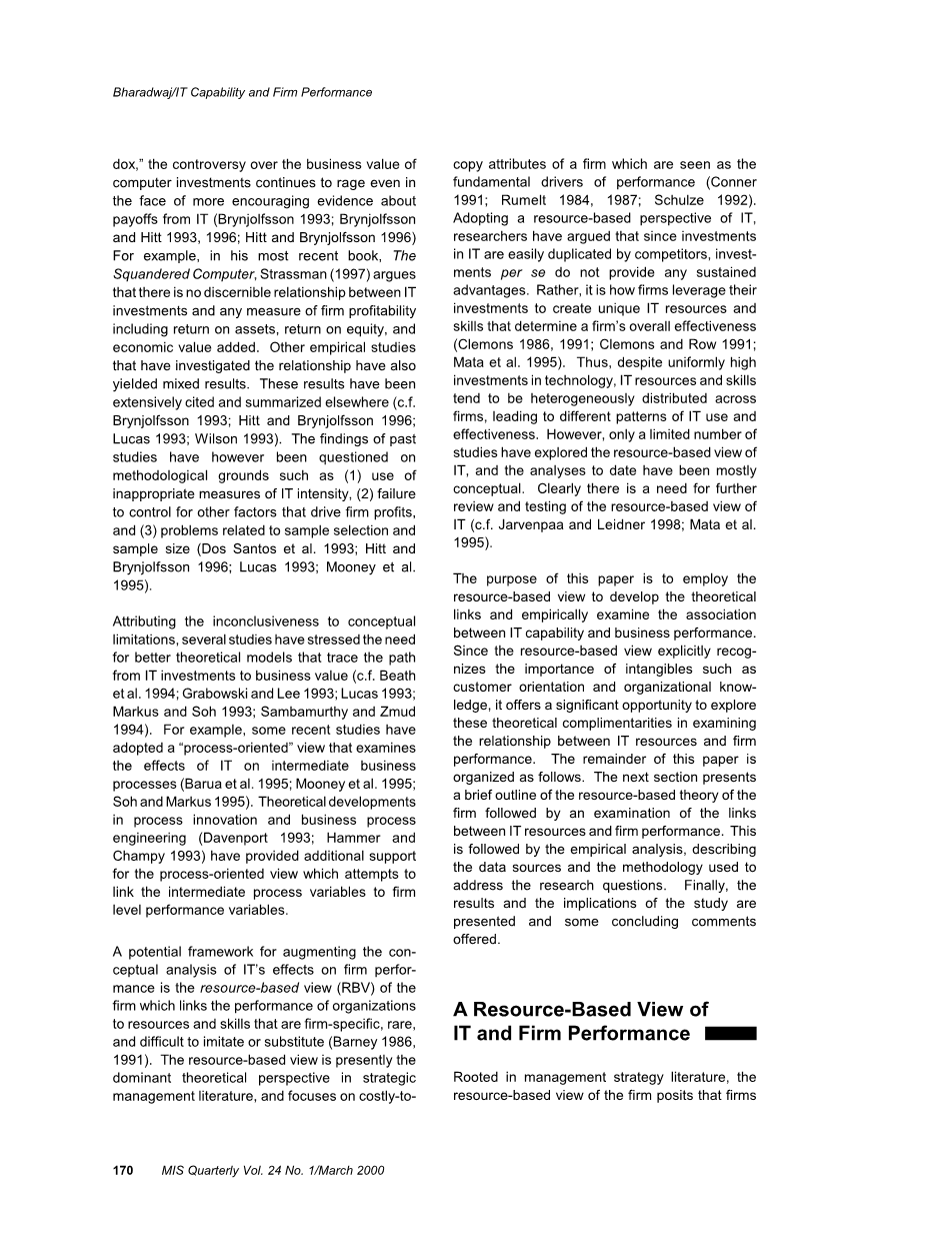 增强IT对企业绩效影响的概念分析的潜在框架是企业基于资源的观点(RBV),它将组织绩效与公司特定、稀有和困难的资源和技能联系起来。基于资源的观点目前是战略管理文献中的主要理论观点,并侧重于公司的高成本复制属性,这被视为绩效的基本驱动因素(Conner 1991; Rumelt 1984,1987; Schulze 1992)。研究人员采用基于资源的IT观点,认为由于IT投资很容易被竞争对手复制,投资本身并没有提供任何持续的优势。相反,它是企业如何利用其投资创造独特的IT资源和技能来决定公司的整体效率(Clemons 1986,1991; Clemons and Row 1991; Mata et al.1995)。因此,尽管对技术的投入一直很高,但IT资源和技能往往在公司间异构分布,从而导致不同的IT使用和有效性模式。然而,只有有限数量的研究探索了基于资源的IT观点,迄今为止的分析主要是概念性的。显然,需要进一步审查和测试基于资源的IT观点(c.f. Jarvenpaa and Leidner 1998; Mata et al. 1995)。