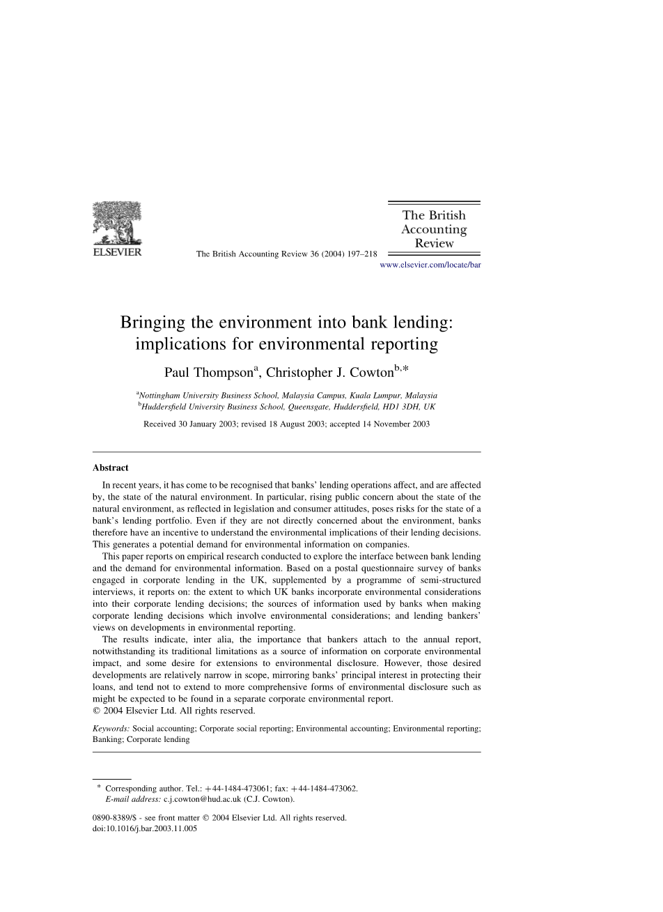 关键词:社会会计; 企业社会报告; 环境会计; 环境报告; 银行业; 企业贷款