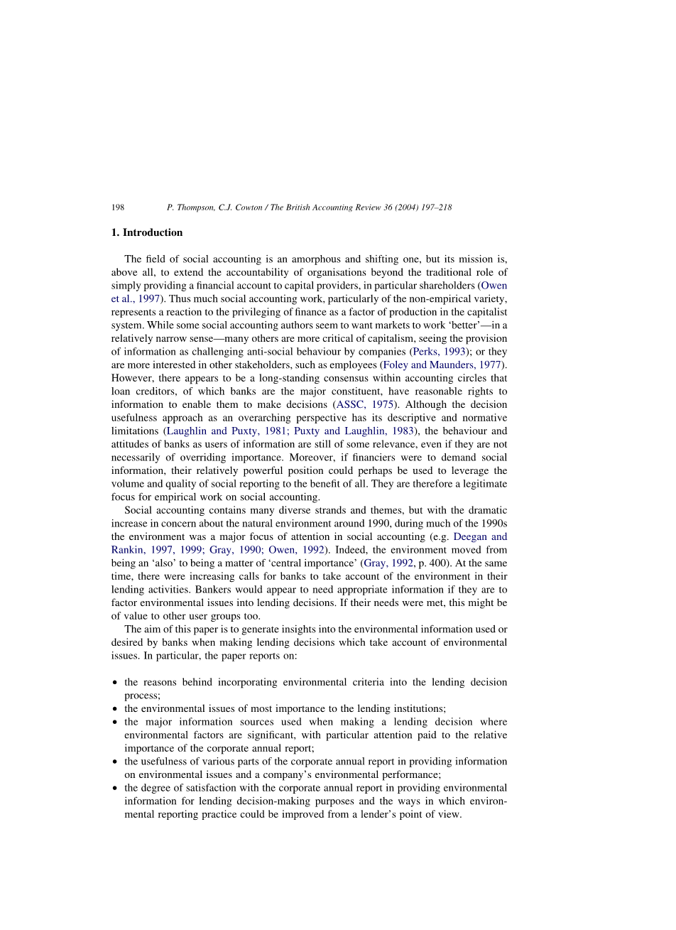 社会会计领域是一个无形和变化的领域,但其使命首先是将组织的问责制扩展到简单地向资本提供者,特别是股东提供金融账户的传统角色(Owen et al,1997)。因此,许多社会会计工作,特别是非经验性的工作,代表了对作为资本主义制度中生产要素的金融特权的反应。虽然一些社会会计作者似乎希望市场“更好”。在相对狭义的意义上,许多其他人更加批评资本主义,将信息提供视为挑战公司的反社会行为(Perks,1993);或者他们对其他利益相关者更感兴趣,例如员工(Foley和Maunders,1977)。然而,在会计界内似乎存在长期共识,即贷款债权人(其中银行是主要成分)拥有合理的信息权利,使他们能够做出决策(ASSC,1975)。尽管作为总体观点的决策有用性方法具有描述性和规范性限制(Laughlin和Puxty,1981; Puxty和Laughlin,1983),但银行作为信息使用者的行为和态度仍具有一定的相关性,即使它们不是必须具有压倒一切的重要性。此外,如果菲尼克斯要求社会信息,他们相对强大的地位也许可以用来利用社会报告的数量和质量来实现所有人的利益。因此,它们是社会核算实证研究的合法焦点。