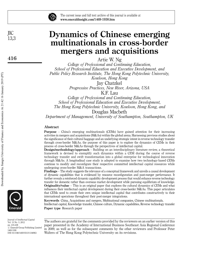 本文旨在探讨CEMs在跨国并购中涉及知识密集型资产的两个方面。首先,它试着解释文化在跨国并购过程中对CEMs知识资本发展的特殊影响。基于跨学科文献综述,它试图构建一个概念框架,将承诺的智力资本的组成部分整合为中国文化系统中的关键资源,这可能促进一个通过跨国并购扩张的CEM逆向技术转移过程。其次,通过纵向案例研究,本文考察了两个CEM试图寻求适时的国际扩张和通过跨国并购促进技术创新的尝试。这两个案例表现出了文化、智力资本发展和通过跨境并购所产生的逆向技术转移之间相互作用的相似性。