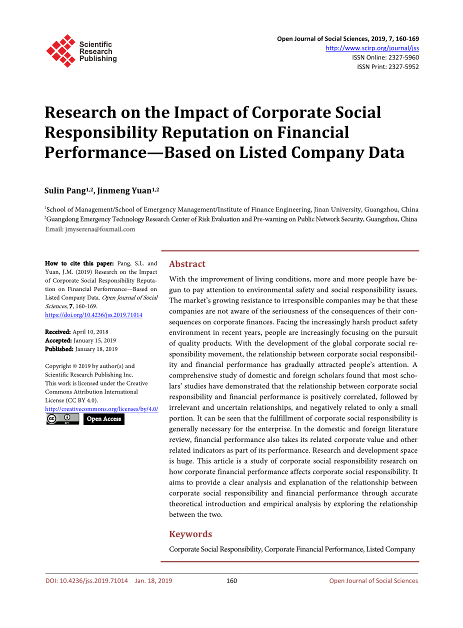 关键词:企业社会责任,企业财务绩效,上市公司