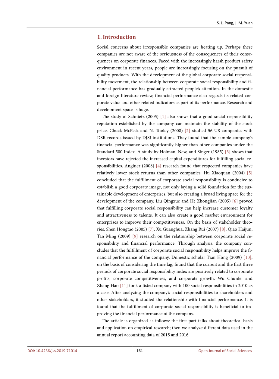 面对近年来日益严苛的产品安全环境,人们越来越注重追求优质产品,对不负责任的公司的社会担忧正在升温。在国内外文献综述中,财务业绩也将其相关的公司价值和其他相关指标视为其业绩的一部分。Schnietz(2005)[1]的研究也表明,公司建立的良好的社会责任声誉可以维持股票价格的稳定性。Chuck McPesk和N. Tooley(2008)[2]研究了56家美国公司DJSJ机构发布的DSR记录。他们发现样本公司的财务业绩明显高于标准500指数下的其他公司。Holman,New和Singer(1985)[3]的一项研究表明,投资者拒绝增加资本支出以履行社会责任。Anginer(2008)[4]研究发现,受尊敬的公司股票回报率低于其他公司。胡小泉(2004)[5]认为,履行企业社会责任有利于树立良好的企业形象,不仅为企业的可持续发展奠定了坚实的基础,也为企业的发展创造了广阔的生存空间。刘庆学和何中建(2005)[6]证明,履行企业社会责任有助于提高客户忠诚度和人才的吸引力。它还可以为企业创造良好的市场环境,提高竞争力。在利益相关者理论的基础上,沉洪涛(2005)[7],徐光华,张锐(2007)[8],乔海军,谭明(2009)[9]研究企业社会责任与财务绩效的关系。通过分析,公司得出结论,履行企业社会责任有助于提高公司的财务业绩。国内学者田红(2009)[10],在考虑时滞的基础上,发现当前和前三个时期的企业社会责任指数与企业利润,企业竞争力和企业成长呈正相关。吴春雷和张昊[11]以2010年的社会责任100人为上市公司。在分析了公司对股东和其他利益相关者的社会责任后,研究了与财务业绩的关系。结果发现,履行企业社会责任有利于改善公司的财务表现。