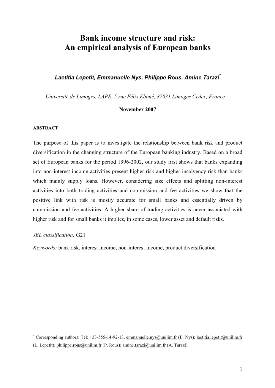 摘要:本文的目的是研究欧洲银行业结构变化中银行风险与产品多元化之间的关系。基于1996-2002年间欧洲银行的数据,我们的研究首先表明,与主要提供贷款的银行相比,拓展非利息业务的银行存在更高的经营风险和更高的破产风险。然而,考虑到规模效应以及将非利息收入分解为交易收入和手续费及佣金收入,我们发现,对于小型银行而言,非利息业务与风险是正相关的,主要由手续费及佣金驱动。交易收入中较高的份额从不与较高的风险相关联;对于小型银行,这意味着在某些情况下,资产和违约风险就越低。