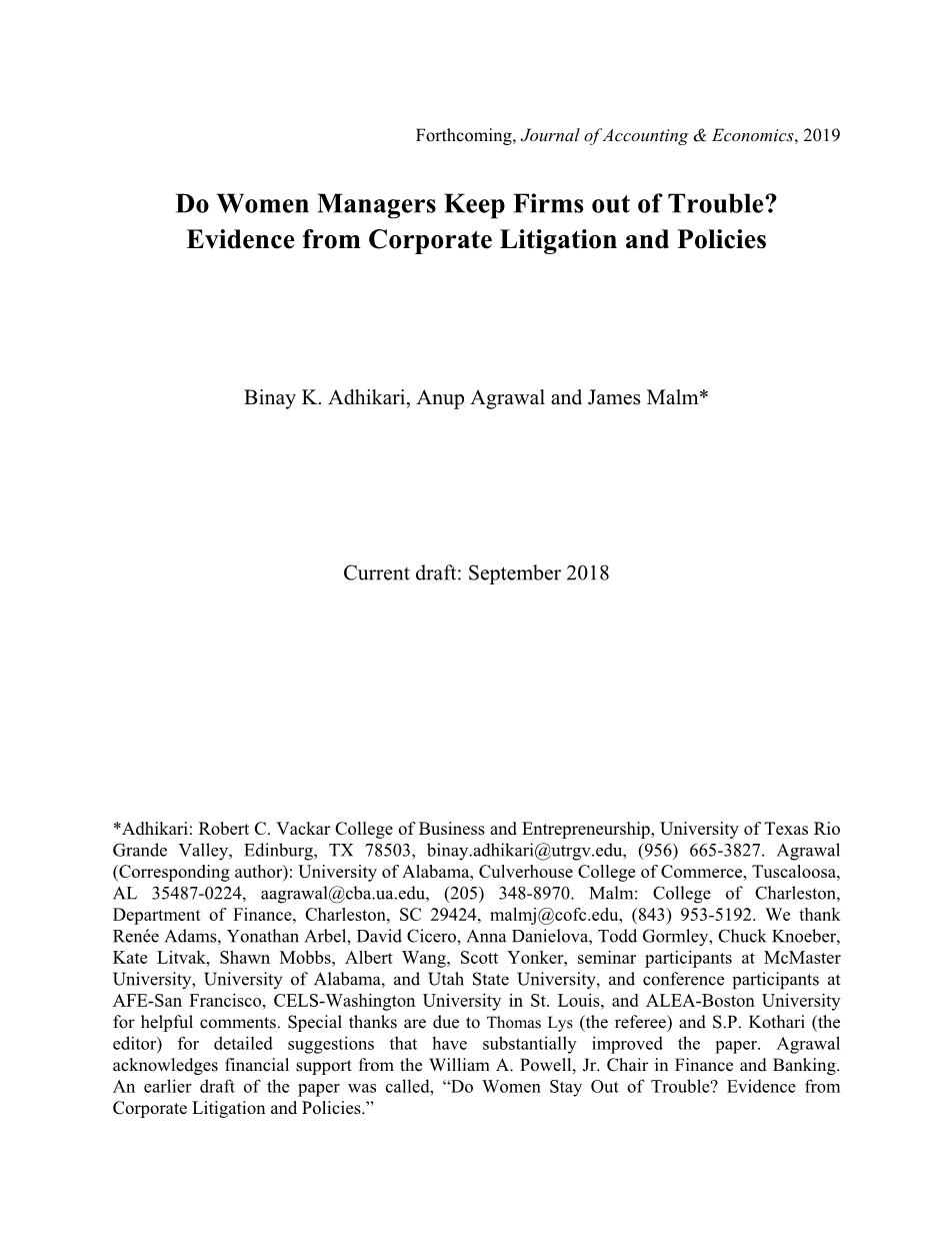题 目 女性经理会让公司远离麻烦吗?公司诉讼和政策证据