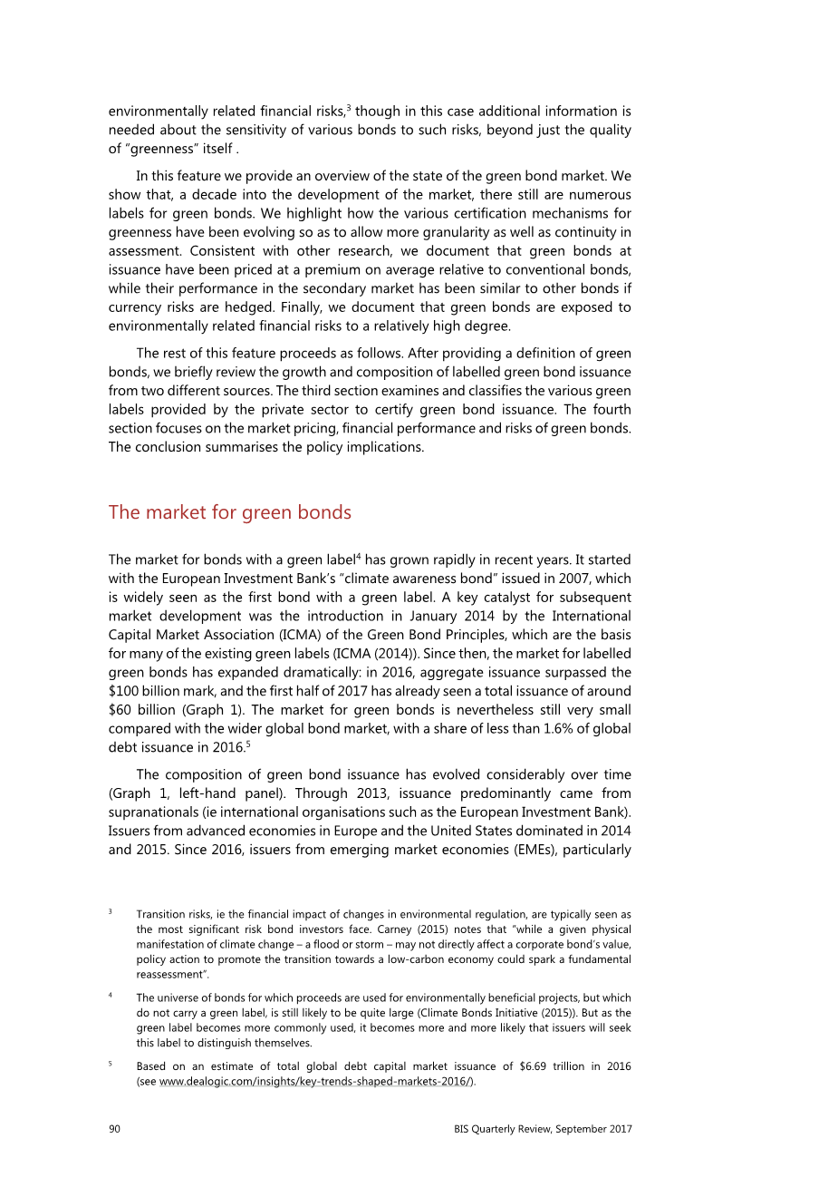 此功能的其余部分按以下步骤进行。在给出了绿色债券的定义之后,我们简要回顾了两个不同来源的贴标绿色债券发行的增长和构成。第三部分对私营部门为证明绿色债券发行而提供的各种绿色标签进行了审查和分类。第四部分主要介绍绿色债券的市场定价、财务绩效和风险。结论总结了政策含义。