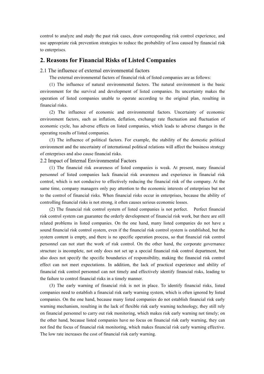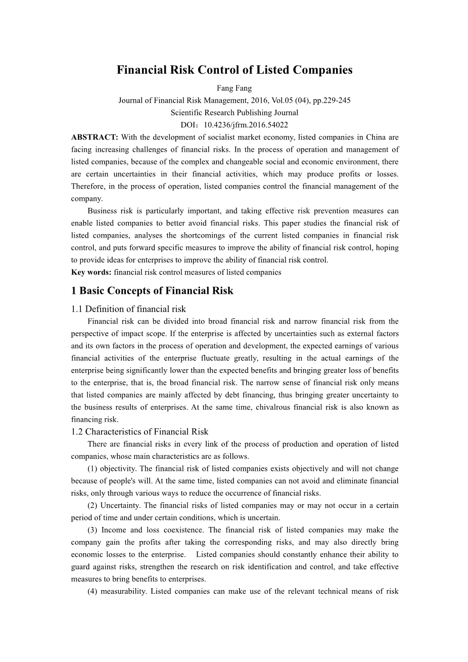 [4] Yang Xinpeng. On Financial Risk Control of Listed Companies [J]. China Foreign Investment, 2013 (23).
