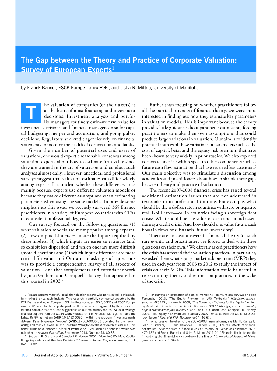 我们的调查集中在下列问题:(1)估值模型是最受欢迎的专家之一,(2)从业人员如何估计这些模型所需的输入,(3)输入更容易估计(因此表现出更少的色散)和哪些是更加困难(分散)和(4)输入差异对估值更重要?我们提出这些问题的目的是为了全面调查评估价值的方方面面,这是约翰·格雷厄姆和坎贝尔·哈维在2002年发表于《华尔街日报》上的一篇文章。
