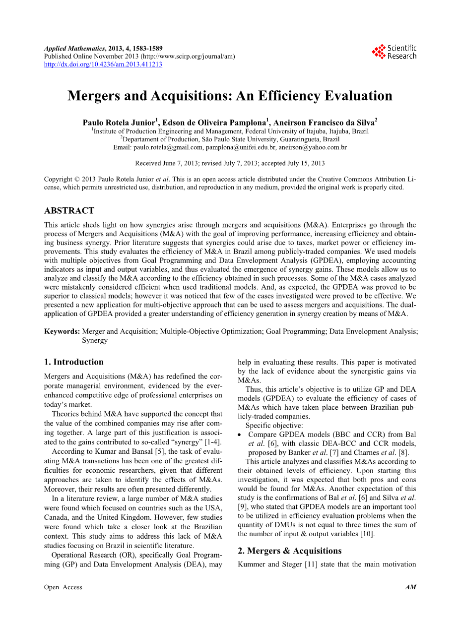 Paulo Rotela Junior, Edson de Oliveira Pamplona, Aneirson Francisco da Silva. Mergers and Acquisitions: An Efficiency Evaluation[J]. Applied Mathematics,2013,04(11).