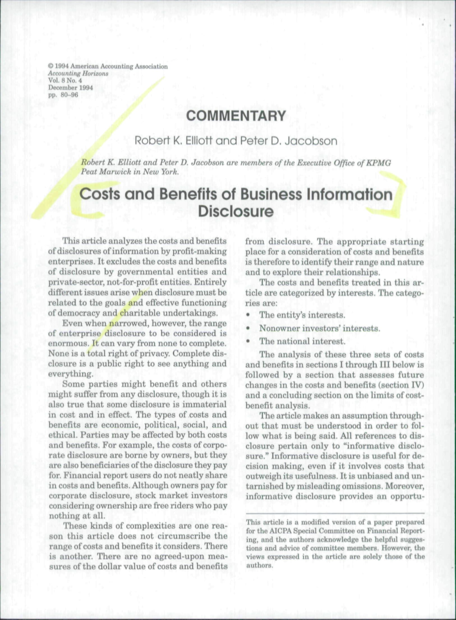 尽管一些信息披露带来的成本和效果是无形的,但是一些组织可能会从中受益,其他的可能会受损。这种成本和收益可能是经济、政治、社会和道德方面的。当事人可能会受到成本费用和收益的共同影响,例如,公司信息披露的成本由自己承担,但同时他们也是他们所承担成本的信息披露的受益者。财务报告使用者不会分享成本和收益,尽管业主支付公司信息披露成本,但是股票市场投资者认为所有者是不需要支付任何费用的搭便车的人。