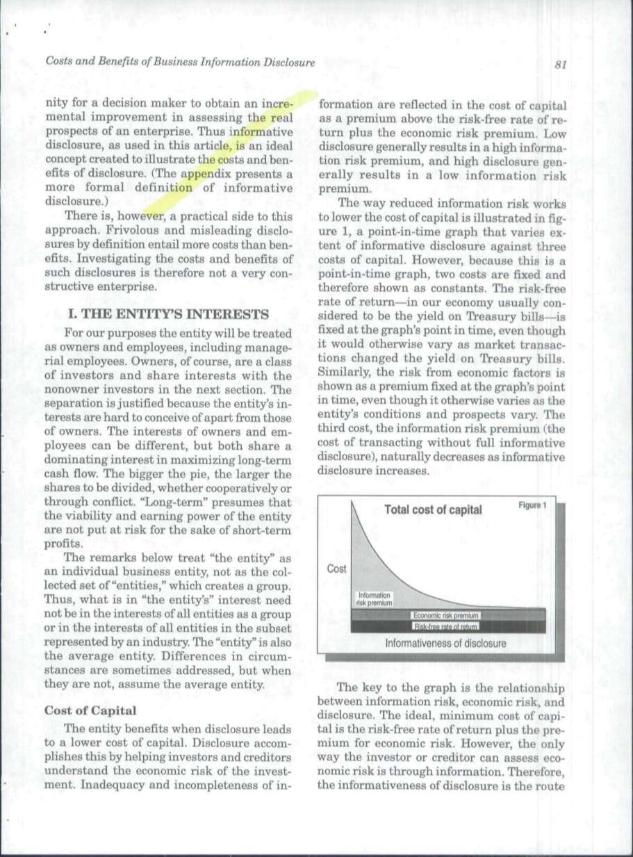 很难用经验证明通过信息披露可以降低资本成本,即使从逻辑和实践方面来说,没有不相关的信息几乎不可能评估一个实体的经济风险。有充足的证据表明,价格是受到信息披露的影响 (有效市场研究),但这是和信息披露可以降低资本成本的经验证据并不一样。我们也知道,资本供应商的要求以及有时要求披露—也就是说,他们有时将披露作为交易的一个条件。大概所需的决策信息被认为是与他们的决策相关的,但是,这是与信息披露可以降低资本成本的经验证据不一样的。最后,还有传闻,比如最近在《纽约时报》1994年的文章《理发师陶德》认为,许多公司意识到机构投资者倾向于将资金投入那些提供大量的信息的企业,并且那些良好的投资者关系可以有利于他们的股票价格。