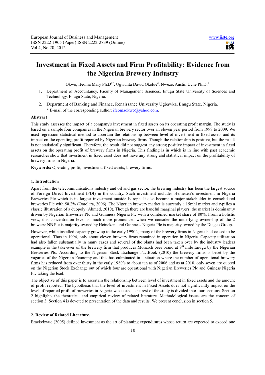 固定资产投资与企业盈利能力之间的关系:以尼日利亚酿酒行业为证