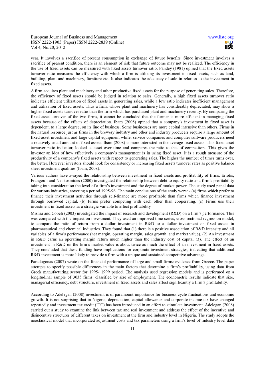 Emekekwue(2005)将投资定义为计划支出的艺术,投资带来的收益预计将超过一年。它涉及到牺牲目前的消费以换取未来的利益。由于投资涉及牺牲目前的条件,存在一个元素的风险导致未来的结果可能无法实现。固定资产的使用效率可以用固定资产周转率来衡量。Pandey(1981)认为固定资产周转率是指企业利用其固定资产(如土地)进行投资的效率,包括建筑物、厂房、机器、家具等,同时表示固定资产出售与投资有关的充分性。