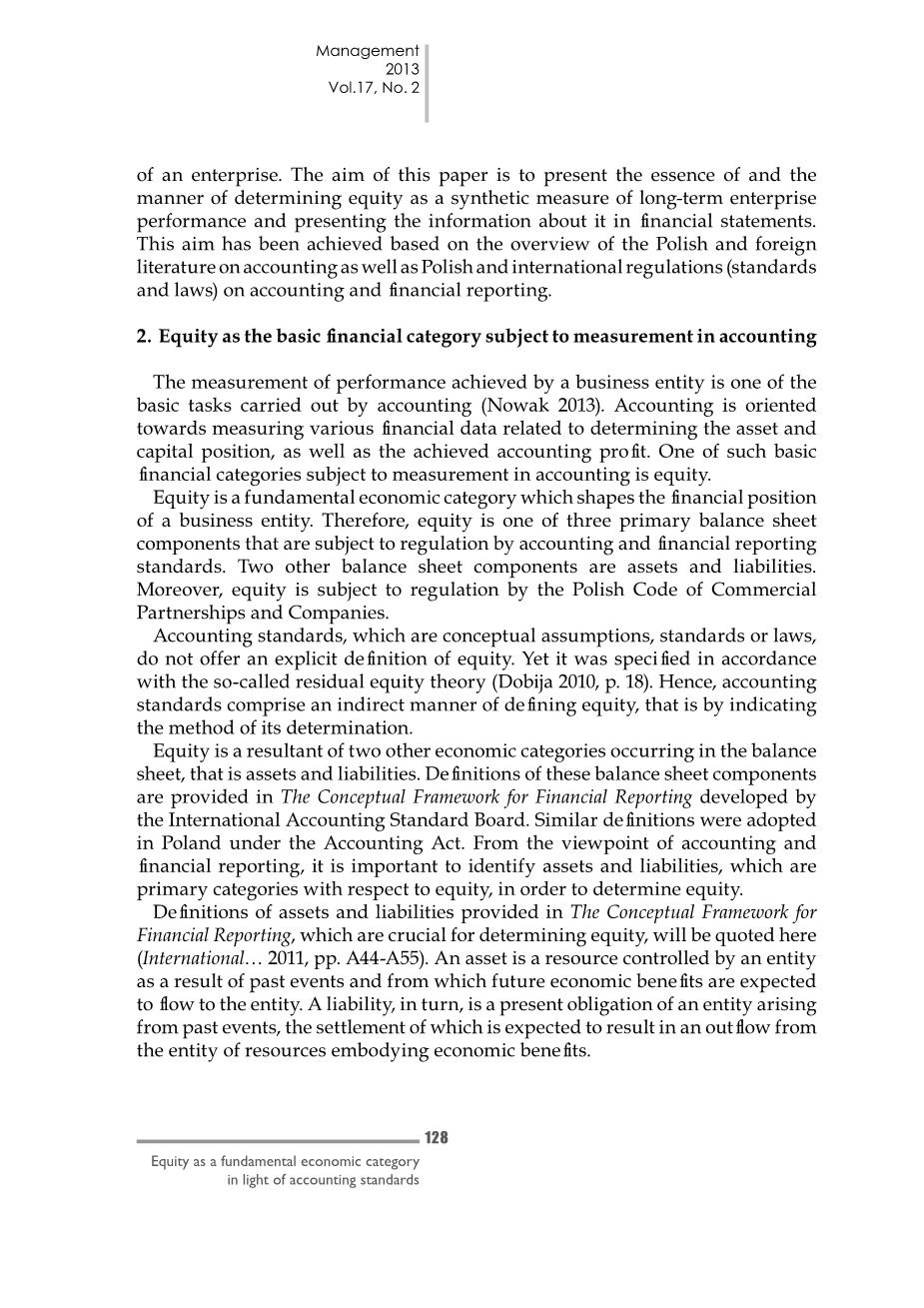 国际会计准则委员会在“财务报告概念框架”中对权益的表述如下:权益是从实体资产中扣除所有负债后的剩余金额(国际hellip;)2011,p.(A44)。波兰“会计法”中采用的折算与“波兰会计法”相似:按价值计算,股本相当于净资产,即实体的资产按负债减值(Acthellip;)2000年,第3款。1低于标准。29)。这意味着会计将资产负债表中的权益与净资产价值联系起来,资产净值是一个实体所有负债结算后的剩余资产数额。