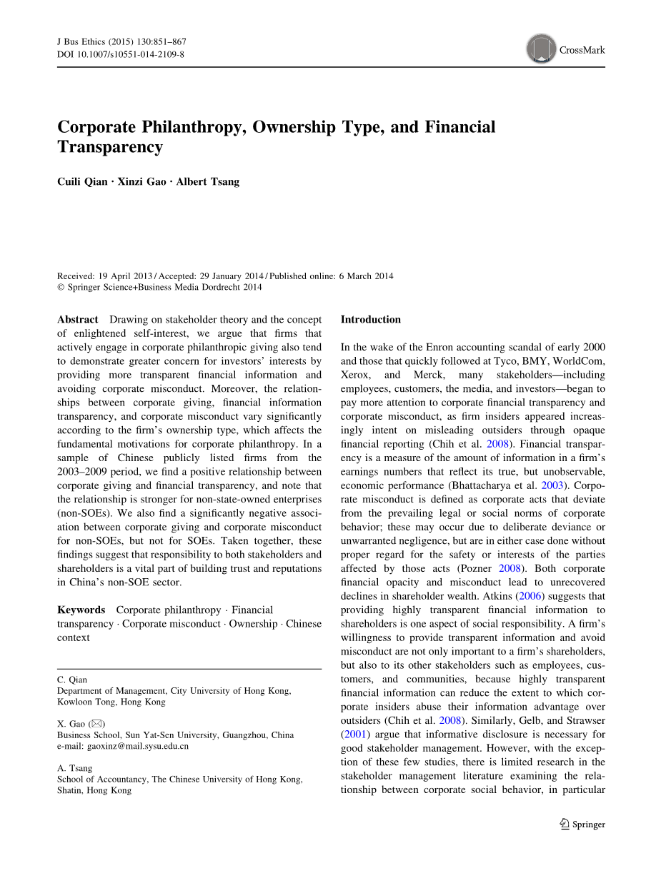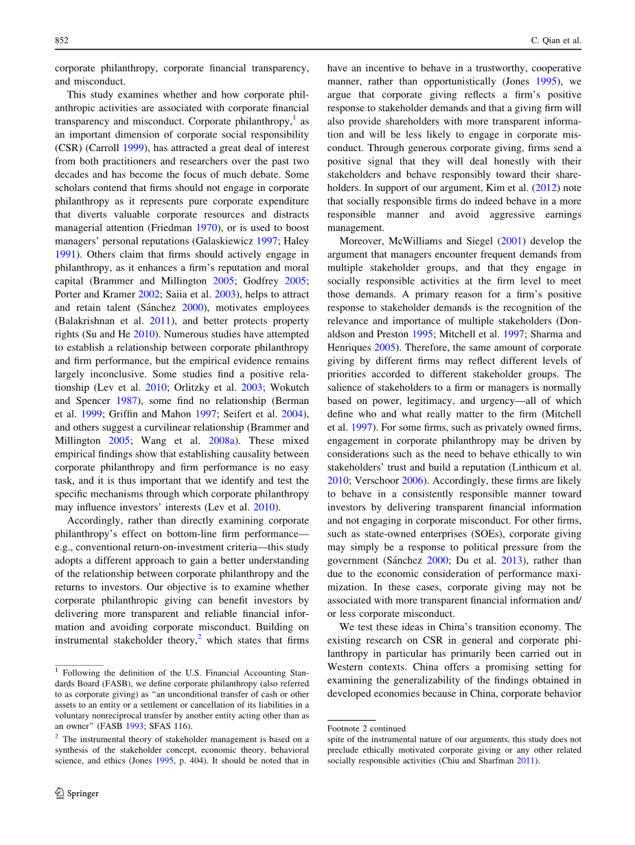 本研究探讨企业慈善活动是否以及如何与企业财务透明度和不当行为相关联。 企业慈善事业,1 作为企业社会责任(CSR)的一个重要方面(Carroll)1999)在过去的二十年中引起了实践者和研究人员的极大兴趣,并成为许多争论的焦点。 一些学者认为,企业不应该参与企业慈善事业,因为它代表了纯粹的公司支出,转移了宝贵的企业资源并分散了管理层的注意力(弗里德曼1970),或者被用来提升管理者的个人声誉(Galaskiewicz1997; 海利1991)。 其他人声称企业应该积极参与慈善事业,因为它可以提高公司的声誉和道德资本(Brammer and Millington2005; 戈弗雷2005; 波特和克莱默2002; Saiia等人2003),有助于吸引和留住人才(Sanchez2000),激励员工(Balakrishnan et al。2011),更好地保护产权(苏和他2010)。 许多研究试图建立公司慈善事业与公司业绩之间的关系,但实证证据仍然很大程度上不确定。 一些研究发现了积极的关系(Lev et al。2010; Orlitzky等人2003; 沃克奇和斯宾塞1987),有些人找不到任何关系(Berman et al。1999; 格里芬和马洪1997; Seifert等人2004)和其他人提出了曲线关系(Brammer和Millington2005; Wang等人2008a)。 这些混合的实证研究结果表明,建立公司慈善事业与公司业绩之间的因果关系并非易事,公司慈善事业可能影响投资者利益的具体机制,因此确定和检验慈善事业显得至关重要(Lev et al。2010).