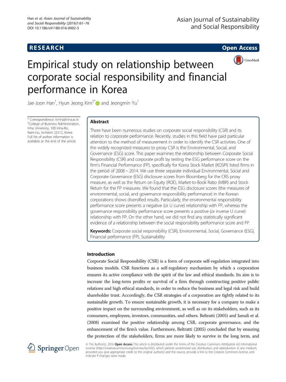 现阶段已经存在许多关于企业社会责任及其与企业绩效关系的文献。近期,此领域的相关文献着重研究测量社会责任的方法。其中一种被广泛认可的测量方法是环境、社会和政府方面(ESG)的社会责任得分。此研究正是通过测算韩国股票市场上市公司的2008-2014年企业绩效(FP)和ESG得分用来探究企业社会责任与企业绩效关系。我们使用来自彭博社的测量社会责任的三个独立层面社会、环境和政府社会责任披露得分EGS以及测量企业绩效的数据包括净资产回报率ROE、市账率MBR和股票回报率。我们发现多元化的结果。特别是环境治理责任与企业绩效呈负相关关系,而政府治理责任与绩效呈正向关系。同时,我们没有发现社会责任表现与企业绩效有显著关系。