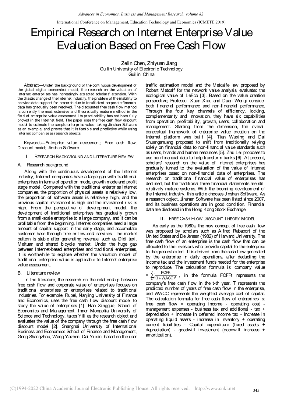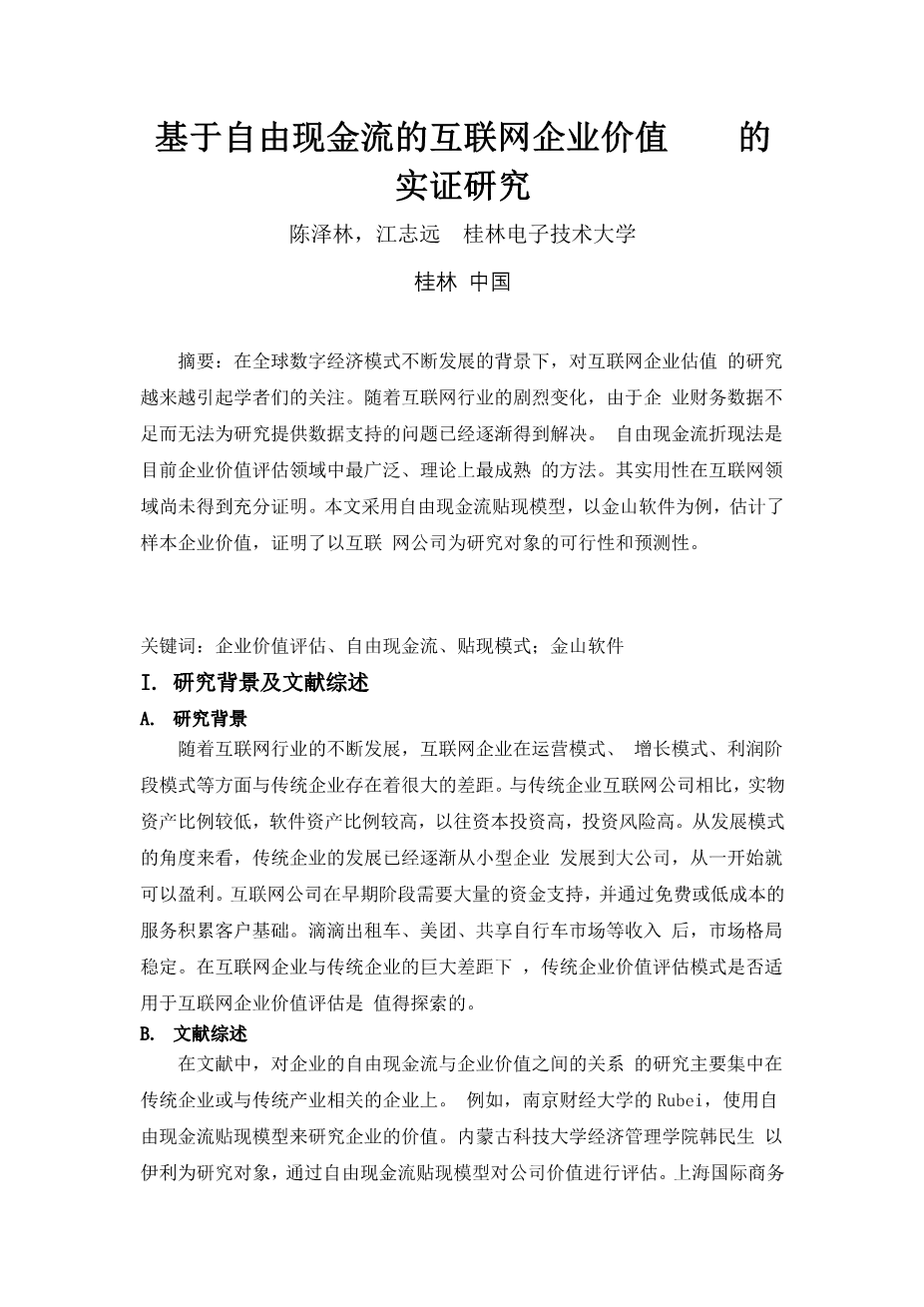 基于自由现金流的互联网企业价值的实证研究外文翻译资料 2023-06-28 11:25:41 英语原文共 6 页,剩余内容已隐藏,支付完成后下载完整资料 英语译文共 10 页,剩余内容已隐藏,支付完成后下载完整资料 资料编号:[603164],资料为PDF文档或Word文档,PDF文档可免费转换为Word 您需要先支付 30元 才能查看全部内容!立即支付 发小红书推广免费获取该资料资格。点击链接进入获取推广文案即可: Ai一键组稿 | 降AI率 | 降重复率 | 论文一键排版 PREVIOUS NEXT 您可能感兴趣的文章 基于Hedonic模型的地铁沿线房地产价格影响因素分析–以苏州地铁2号线沿线为例开题报告 江苏省上市公司经济增加值测算与结果分析开题报告 互联网对公司财务管理的影响—–以青岛海尔集团为例开题报告 产权性质、研发投入与企业绩效–基于信息技术企业的实证分析文献综述 女性管理者对碳信息披露水平的影响文献综述 基于COSO内部控制框架的我国制造业上市公司企业信息披露现状评价开题报告 内部控制与企业价值增长文献综述 我国分行业经济增加值测算与结果分析开题报告 盈余管理与投资效率的相关性研究——以新能源行业上市公司为例开题报告 外商投资对江苏省上市公司职工收入的影响开题报告