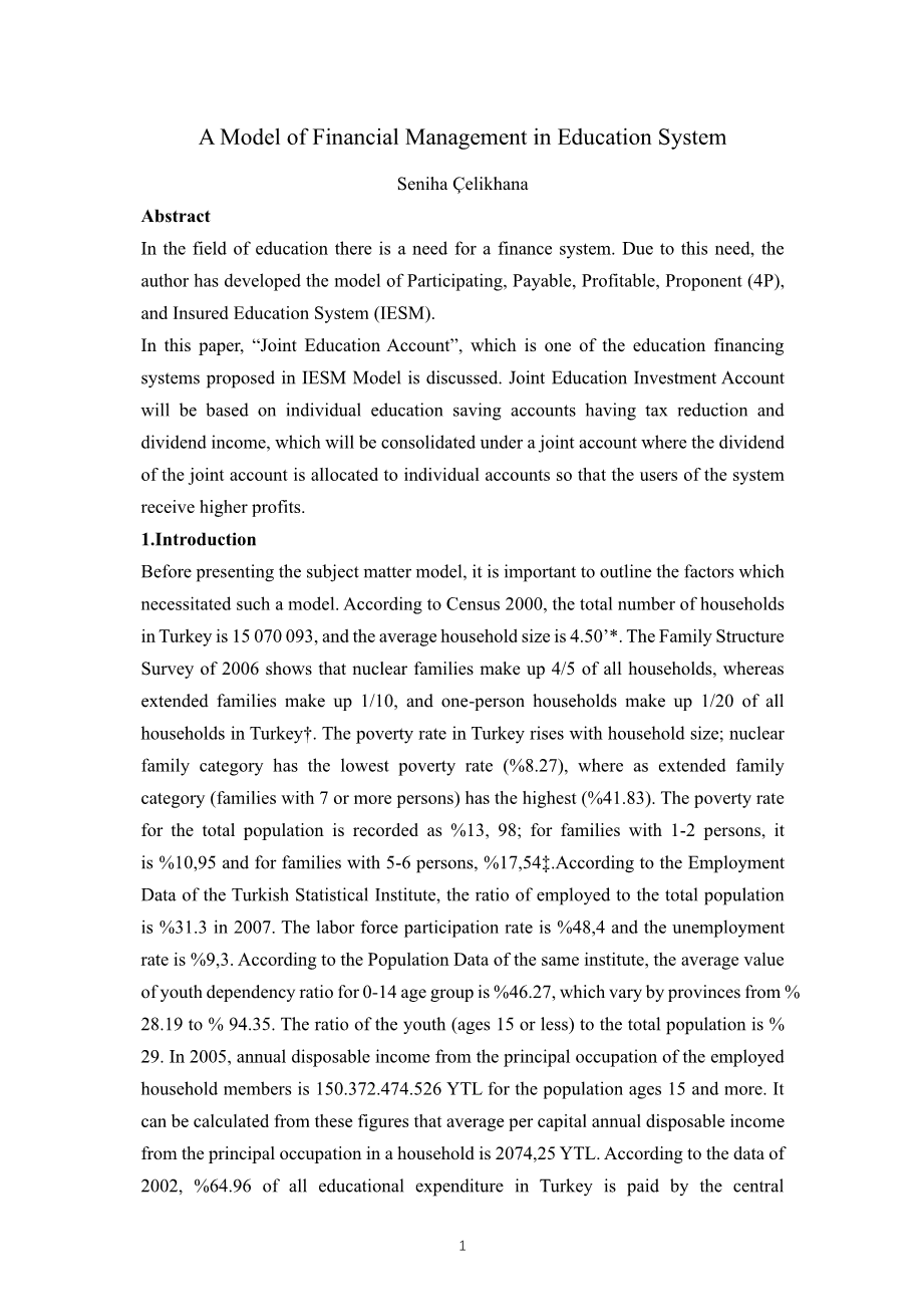 但是,只有像Kouml;ye-SES模式那样,根据家庭、教育机关、金融机关之间的三角关系,修改现有的教育制度,才能实现共同教育投资账户制。提出利用投资账户时,年终分红上述存款在这些账户目前的年利率将46 300 502,为幼儿园4 YTL, 2 390 655 754 YTL小学,高中1 427 454 882 YTL, 871 101 812 YTL一般中学,中专781 828 796YTL,大学7308 222 759 YTL。总数为12 825 564 505 YTL。2008年,财政部拨给教育的年度预算为28 739 000 001 YTL。从上面的计算可以看出,每年用于教育的正常利息支出占这个值的45%。家庭参与教育支出(不收取额外费用)的比例将从33%提高到45%。这个计算是基于正常利率。然而,如果管理得当,一次性存款的收益要高得多。随着金融机构采取激励措施来吸引这些投资资金,家庭可能会在教育开始之前很久就开始投资这些账户,从而增加他们未来获得更高报酬的机会。由于一个学年比一个日历年短,多余的钱将会在下一个学年的账户中累积。