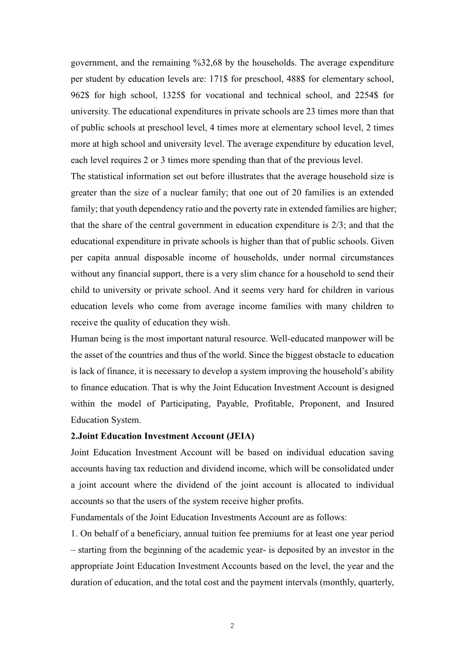 人是最重要的自然资源。受过良好教育的人力资源将成为国家乃至世界的财富。由于教育的最大障碍是缺乏资金,因此有必要开发一种提高家庭教育资金能力的制度。这就是为什么联合教育投资帐户被设计成参与、支付、盈利、建议者和保险教育系统的模式。