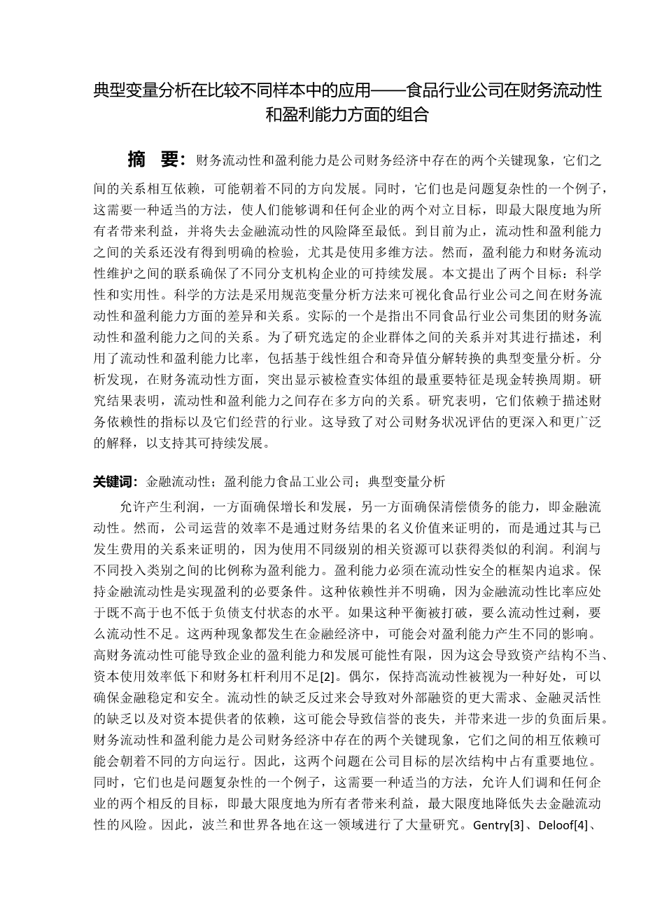 典型变量分析在比较不同样本中的应用——食品行业公司在财务流动性和盈利能力方面的组合外文翻译资料 2023-07-03 09:28:42 英语原文共 16 页,剩余内容已隐藏,支付完成后下载完整资料 英语译文共 42 页,剩余内容已隐藏,支付完成后下载完整资料 资料编号:[602880],资料为PDF文档或Word文档,PDF文档可免费转换为Word 您需要先支付 30元 才能查看全部内容!立即支付 发小红书推广免费获取该资料资格。点击链接进入获取推广文案即可: Ai一键组稿 | 降AI率 | 降重复率 | 论文一键排版 PREVIOUS NEXT 您可能感兴趣的文章 基于Hedonic模型的地铁沿线房地产价格影响因素分析–以苏州地铁2号线沿线为例开题报告 江苏省上市公司经济增加值测算与结果分析开题报告 互联网对公司财务管理的影响—–以青岛海尔集团为例开题报告 产权性质、研发投入与企业绩效–基于信息技术企业的实证分析文献综述 女性管理者对碳信息披露水平的影响文献综述 基于COSO内部控制框架的我国制造业上市公司企业信息披露现状评价开题报告 内部控制与企业价值增长文献综述 我国分行业经济增加值测算与结果分析开题报告 盈余管理与投资效率的相关性研究——以新能源行业上市公司为例开题报告 外商投资对江苏省上市公司职工收入的影响开题报告