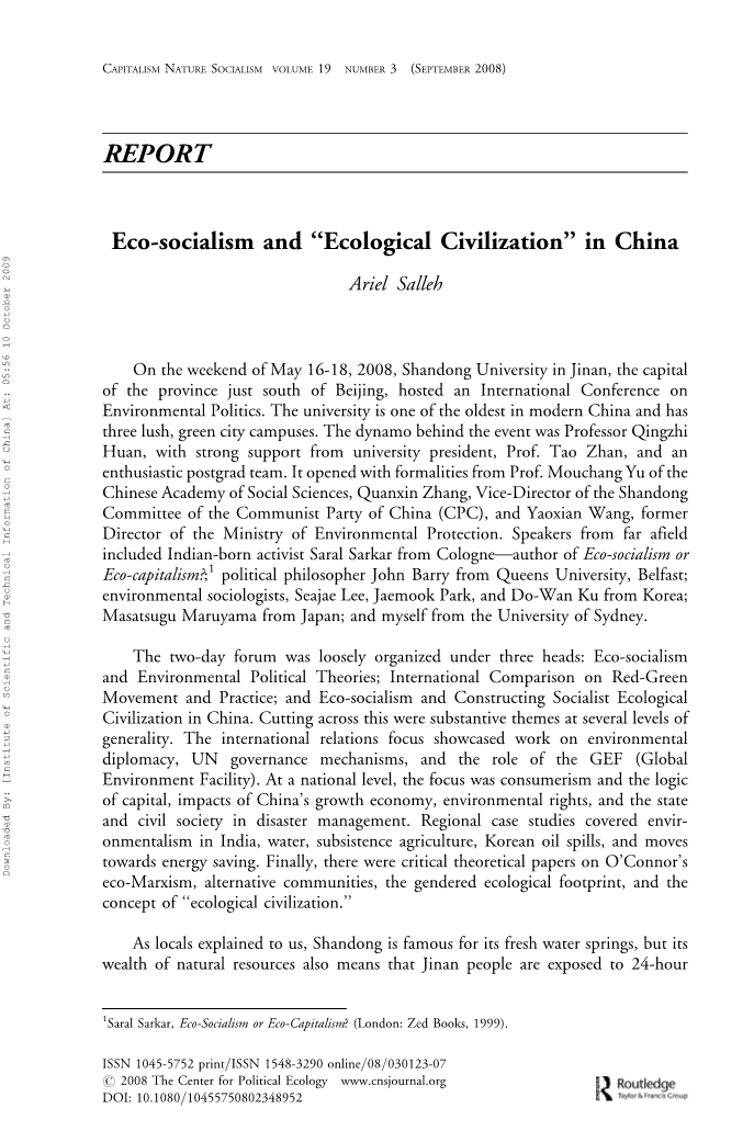 但不是每个人都解释生态社会主义或生态女权主义的方式。有些人甚至可能看到一个推动新自由主义市场的机会。在准则之下。在这种情况下,我很想知道莫里斯·斯特朗参与里约地球峰会并促进生态旅游的加拿大商人,作为对哥斯达黎加经济的一种救济,现在生活在中国。而且,强者是对“生态文明”感兴趣*生态社会主义与“生态文明”127下载人:【中国科学技术信息研究所】2009年10月10日05:56大学。把两个和两个放在一起,我突然想到莫里斯·斯特朗1世纪议程项目,可能会在未来几年内被新一轮全球企业政策倡议的灵感或回应亚洲强国。