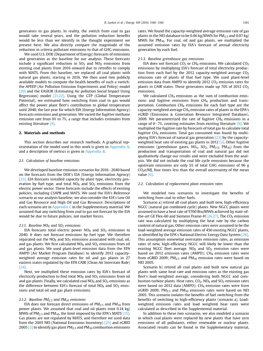 我们将美国能源部(Energy Department)的能源部排放和排放量预测作为我们分析的基准。 这些预测包括由于改装符合MATS,从2016年起,现有煤电厂的二氧化硫和氮氧化物排放量大幅减少。 从这个基线,我们从2016年开始,替代了所有使用天然气工厂的燃煤电厂。然后,我们使用两种公开的模型来计算这种转换的健康效益:APEEP(空气污染物排放实验和政策)模型[20]和 EASIUR(估计空气污染社会影响回归)模型[21]; [22]。 使用GTP(全球温度势),我们估计,到2040年,EIA(能源信息机构)预测排放和发电的最后一年,煤炭到天然气的转换将如何影响电厂车队对全球气温的贡献。 我们将逃逸甲烷排放率从0%变为7%,这一范围包括现有文献[9]的估计。