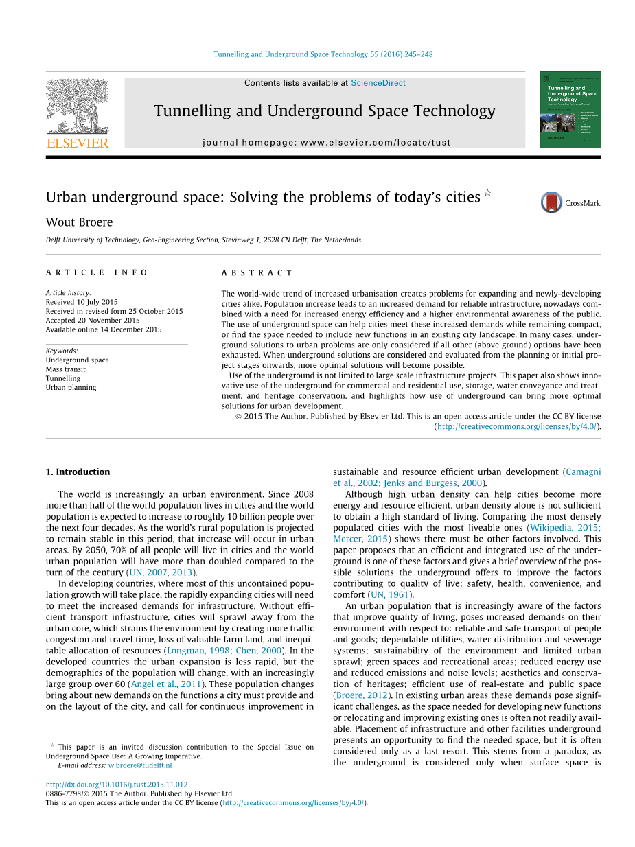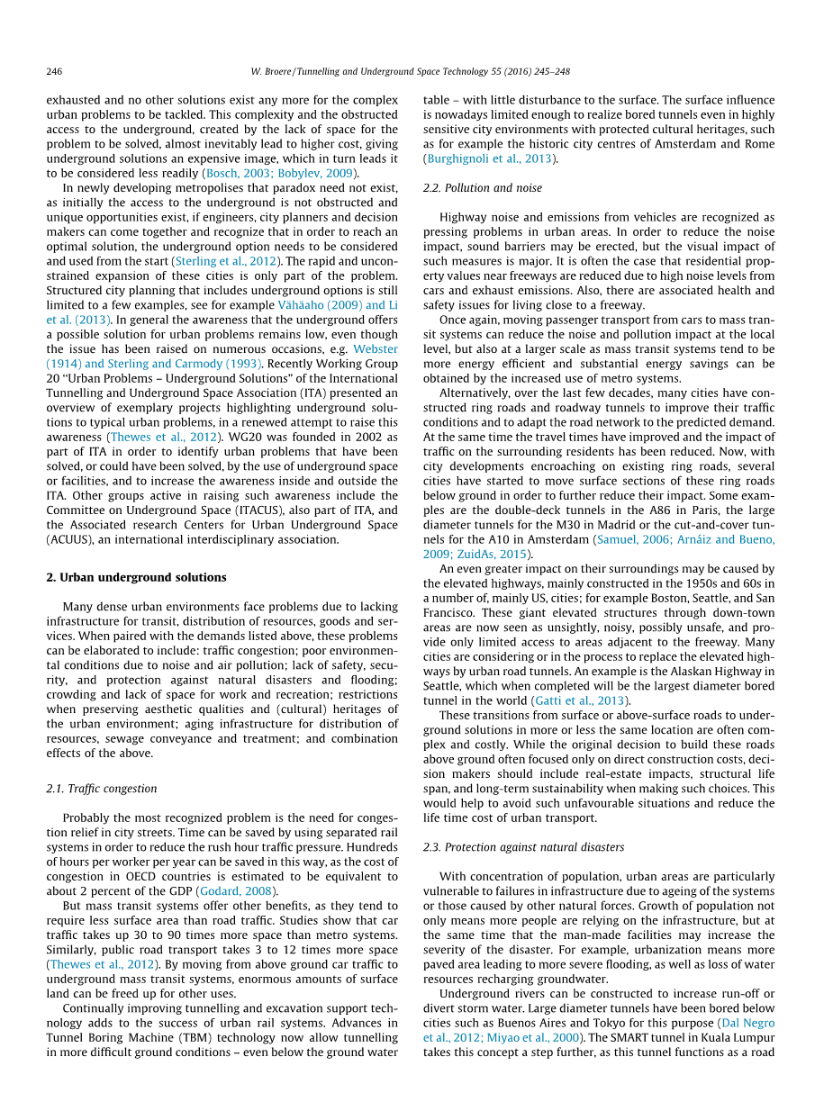 城市人口提高生活质量的意识越来越强烈,对人类和商品的可靠性、安全运输及环境提出了更高的要求:如可靠的公用事业、配水和污水处理系统;环境的可持续性和有限的城市扩张;绿地和娱乐区;减少能源使用并降低排放和噪音水平;美学和遗产保护;有效利用房地产和公共空间(Broere,2012)等。在现有的城市地区,这些要求对城市来说是一个巨大的挑战,因为开发新功能或重新定位和改进现有功能所需的空间是不容易得到的。在地下建设基础设施提供了找到我们所需空间的机会,但它通常被认为是最后的手段。这源于一个悖论,即只有当地上空间被耗尽并且不再有其他方案可以解决复杂的城市问题时才会被考虑。由于缺乏解决问题的足够空间造成的复杂性以及地下通道的阻碍性几乎不可避免地导致了更高的成本,使地下解决方案形成了一种昂贵的形象,也因为如此很多人认为地下解决方案非常困难(Bosch, 2003; Bobylev,2009)