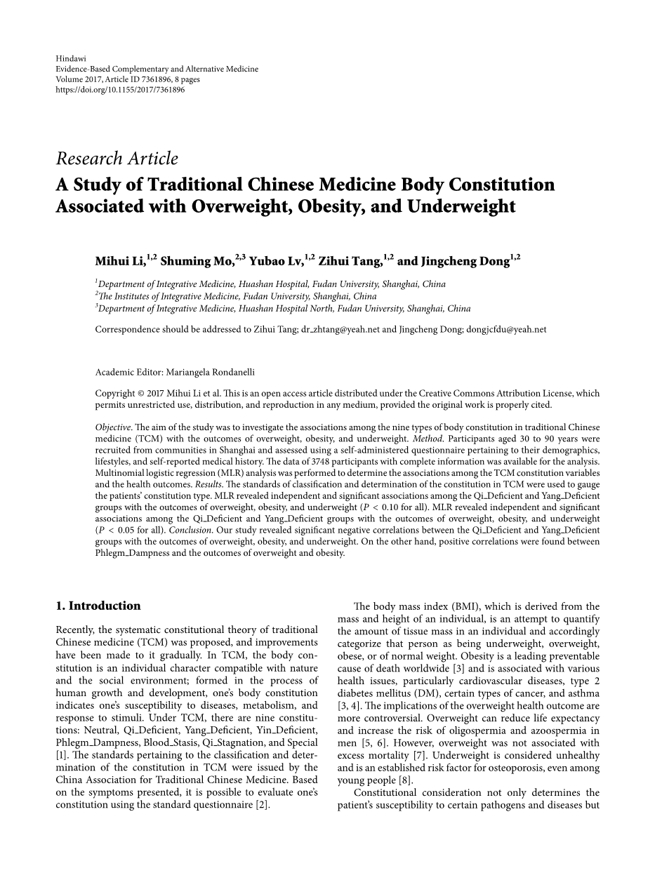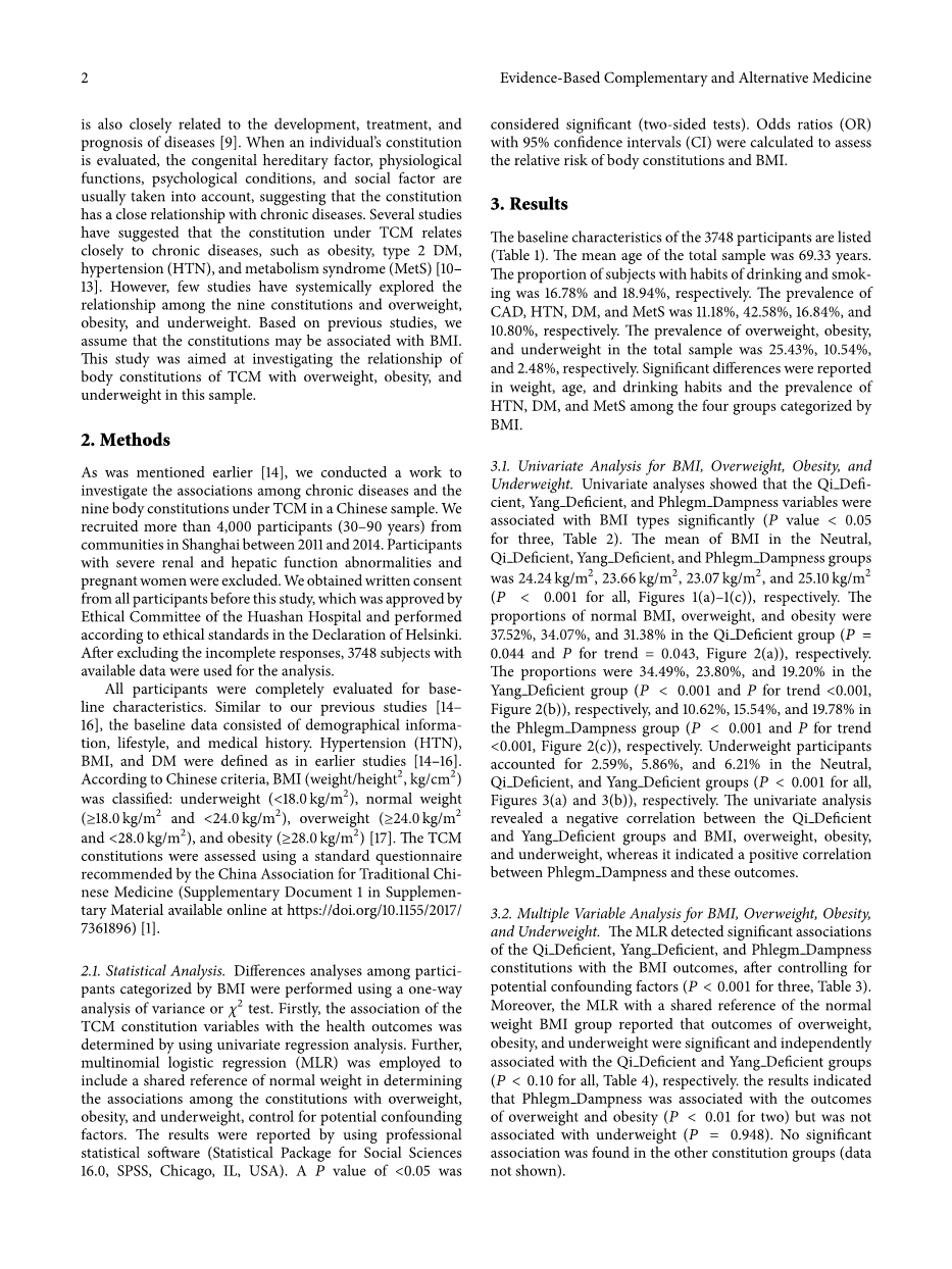 近年来,提出了系统的中医体质理论,并对其进行了逐步的改进。在中医中,身体构成是与自然和社会环境相适应的个体特征。在人体生长和发育过程中形成的人体结构表明其对疾病,新陈代谢和对刺激的反应的敏感性。在中医之下,有九种体质:平和质,气虚质,阳虚质,阴虚质,痰湿质,湿热质血瘀质,气郁质,特禀质[1]。中国中医协会发布了有关中医体质分类和确定的标准。根据出现的症状,可以使用标准调查表评估自己的体质[2]。体重指数(BMI)是从个体的体重和身高中得出的,它是试图量化个体的组织量,并因此将该人归类为体重过轻,超重,肥胖或体重正常的一种尝试。肥胖是全球范围内可预防的主要死亡原因[3],并与各种健康问题相关,尤其是心血管疾病,2型糖尿病(DM),某些类型的癌症和哮喘[3, 4]。超重健康结果的含义更具争议性,超重会降低男性预期寿命并增加男性少精症和无精症的风险[5, 6]。但是,超重与过度死亡率无关[7]。体重过轻被认为是不健康的,并且是确定的骨质疏松症危险因素,即使在年轻人中[8]。
