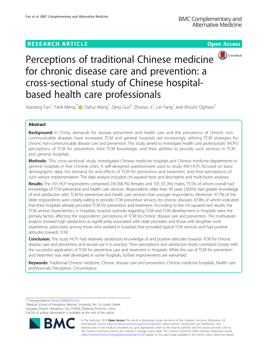 中医药防治慢性病的认知:基于中医院医务人员的横断面调查