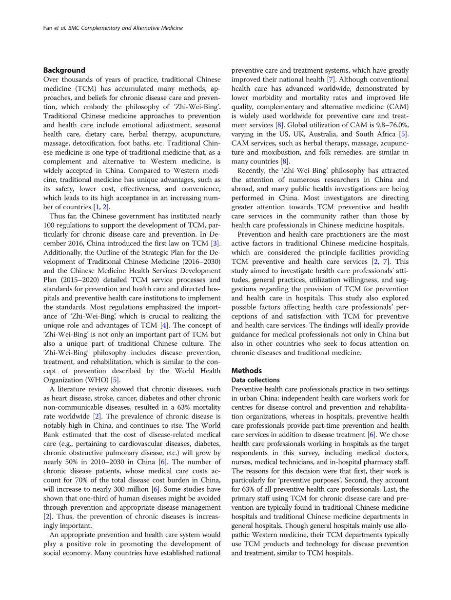 我们收集的信息包括基本的人口统计数据、对卫生保健行业的看法和当前情况,以及对中医药在医院预防和保健方面的需求和影响。训练有素的调查人员(本科生和研究生)在完成问卷后立即收集问卷,并确定是否有任何信息丢失。当信息丢失时,调查人员联系受访者修改问卷。招募训练有素调查人员录入问卷。随机评估在输入数据之前进行,如果错误率超过1%,则需要重新输入。