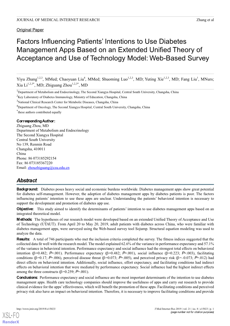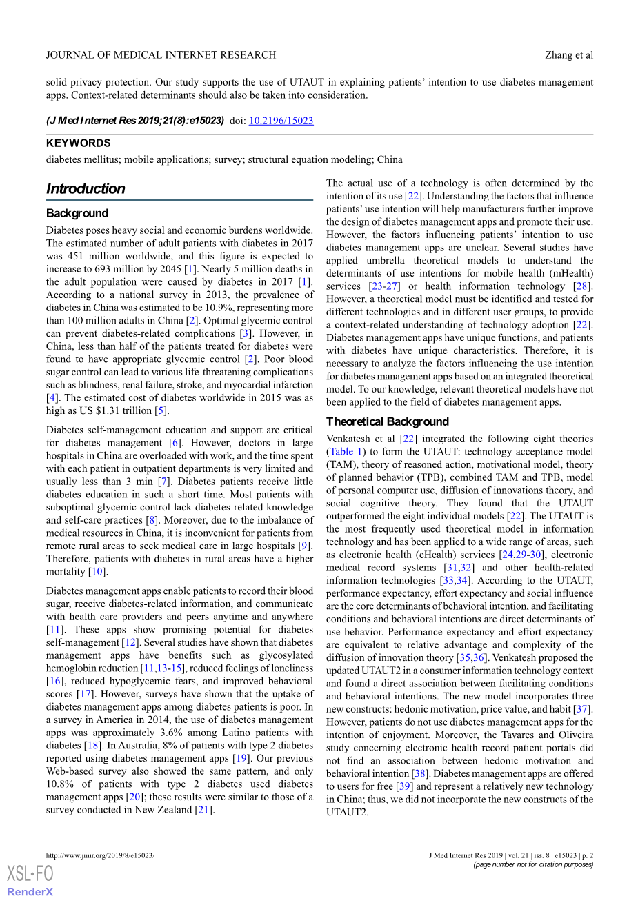 基于扩展的UTAUT理论的糖尿病管理应用程序使用意愿的影响因素:基于网络的调查