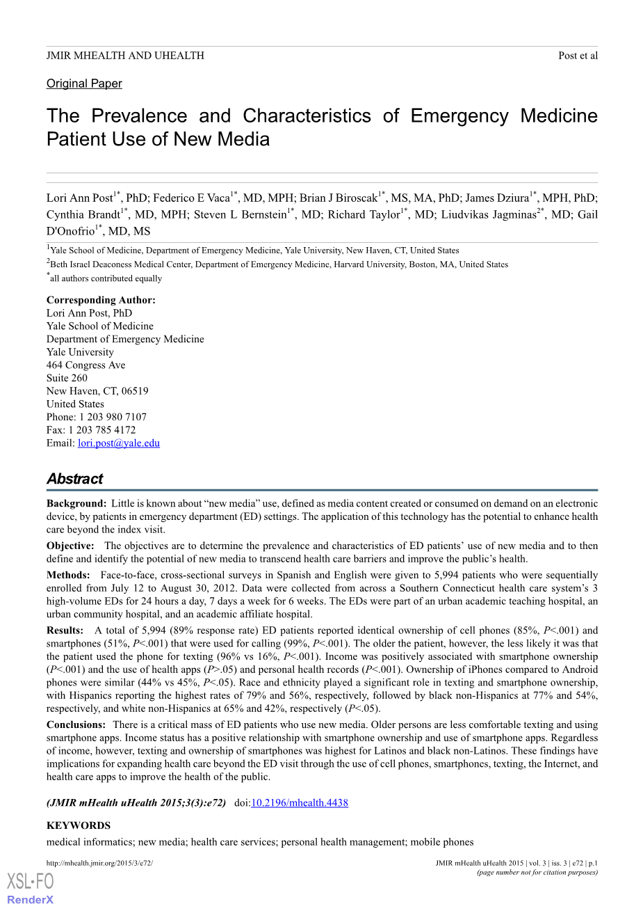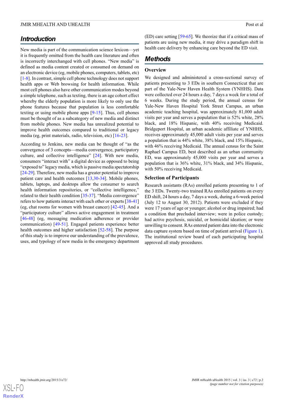 根据Jenkins,新媒体可以被认为是“作为3个概念的融合 - 媒体融合,文化参与和集体智慧”[24]。使用新媒体,消费者与数字设备“交互”,而不是“暴露于”作为被动的媒体观众的传统媒体 [24-29]。因此,新媒体有更大的潜力改善病人护理和健康结果[13,30-34]。移动电话,平板电脑,笔记本电脑和台式机允许消费者搜索与他们的健康状况相关的健康信息库或“集体智慧”[35-37]。“媒体融合”是指患者如何与其他患者或专家进行交互[38-41](例如,为患有乳腺癌的女性设置的聊天室)[42-45]。“文化参与”鼓励积极参与治疗[46-48](例如,传递的药物信息依从性或提供者的沟通)[49-51]。参与的患者体验更好的健康结果和有更高的满意度[52-58]。这项研究的目的是为了提高我们对新媒体在急诊科(ED)护理环境中的普遍性,用途和类型的理解[59-65]。我们推测,如果临界量的患者正在使用新的媒体,它可能通过增强ED的访问之外的护理推动医疗保健提供的范式转变。