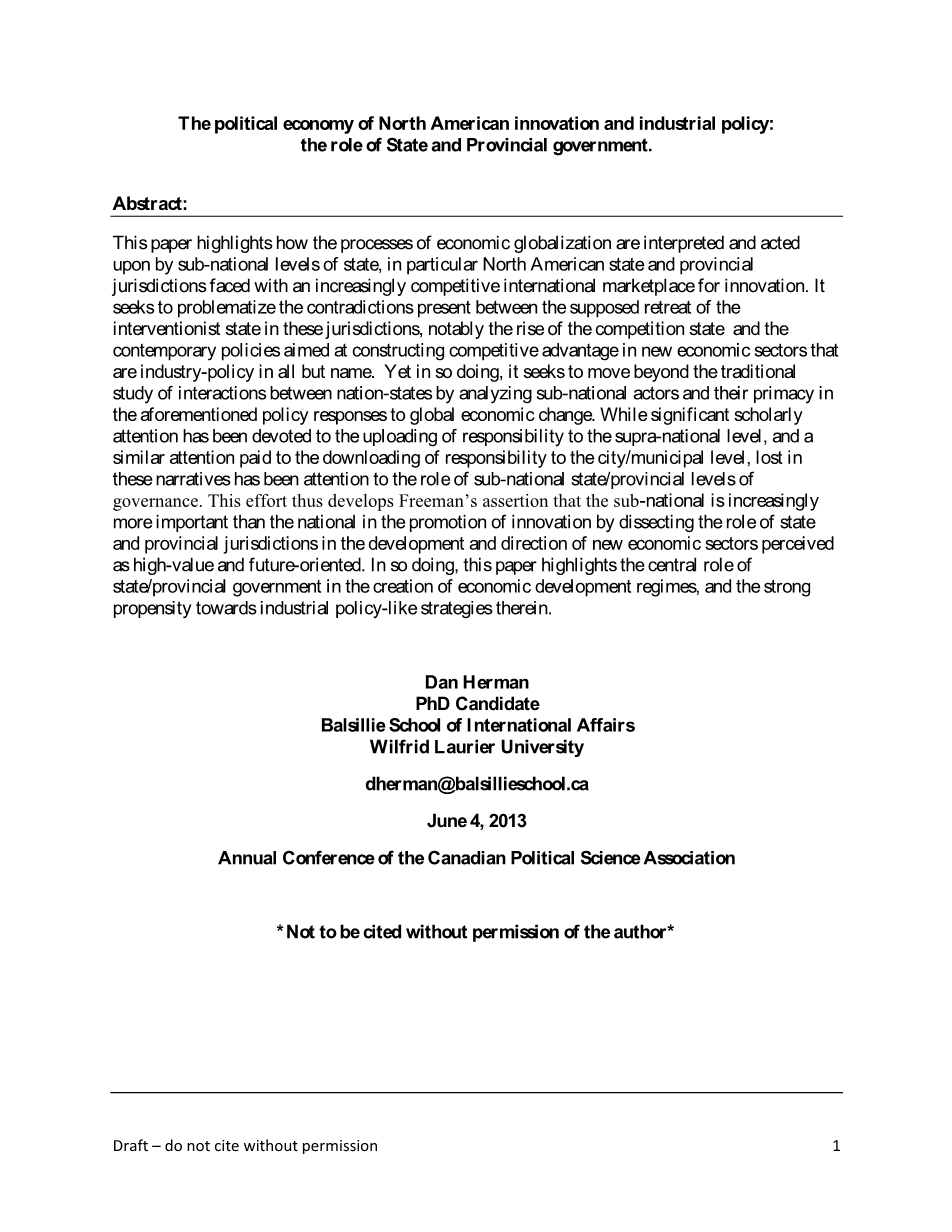 本文强调了面临竞争日益激烈的国际创新市场,国家的地方层面,特别是北美国家和省级管辖区如何解释经济全球化进程及如何在经济全球化进程中采取行动。本文试图将这些管辖区内干预主义国家——特别是新兴的竞争国家所谓的回避政策,以及那些意图在实际上而非名义上是行业政策的新经济部门中建立竞争优势的当代政策之间的矛盾问题化。然而,在此过程中,本文通过分析地方国家政策实施者及其在应对上述全球经济变化的政策中所处的重要地位,从而试图超越传统的对国家民族间的互动研究。虽然有重大影响力的学术关注在于超国家层面的责任的上移,以及与此相似的市或市政府层面的责任的下放,但是这些叙述中缺少了对国家地方层面或省级管理管理作用的关注。通过剖析国家和省级管辖区在被视为高价值和面向未来的新经济领域发展方向上的作用,印证了弗里曼的主张,即相比国家,地方在创新方面发挥着越来越重要的作用。在此,本文强调了国家或省级政府在创造经济发展制度中的核心作用,并强调了产业政治性战略的强烈倾向。