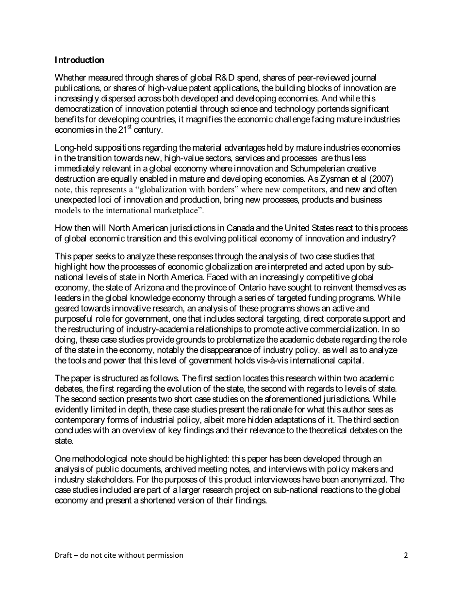 本文旨在通过两个案例的研究分析来分析这些反应,这两个案例研究强调了北美国家的地方层面如何解释经济全球化进程及如何对经济全球化进程采取行动。面对日益竞争激烈的全球经济,亚利桑那州和安大略省试图通过一系列有针对性的资助计划,将自己重塑为全球知识经济的领导者。在面向创新研究的同时,对这些计划的分析显示了政府积极的、目的化的作用,包括部门目标、直接的企业支持及重组行业与学术的关系,以促进积极的商业化。据此,这些案例研究提出理由将国家在经济中的作用的学术争论问题化,特别是行业政策的消失;同时,分析了政府层面关于国际化资本的工具和权利问题。