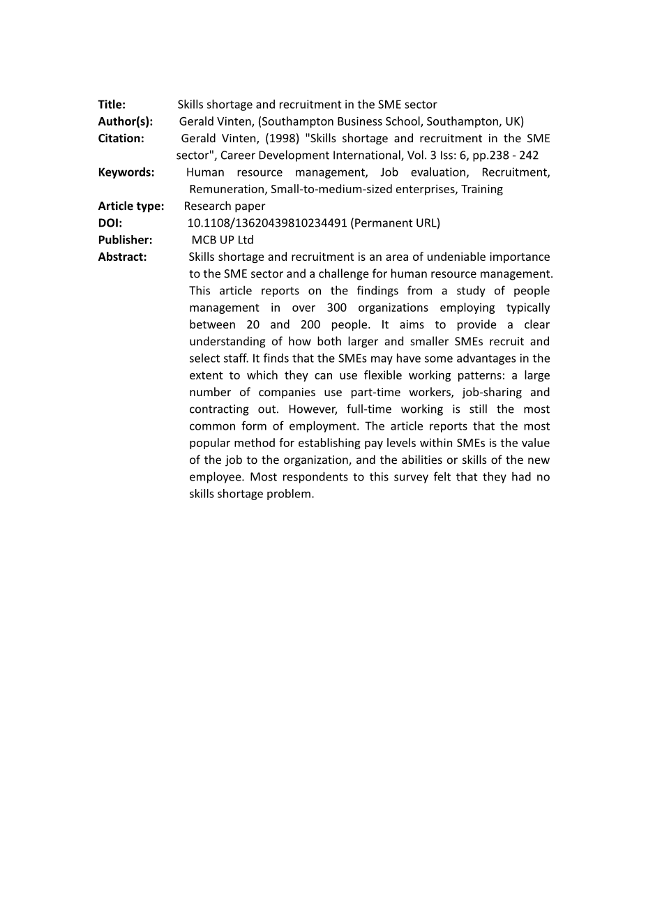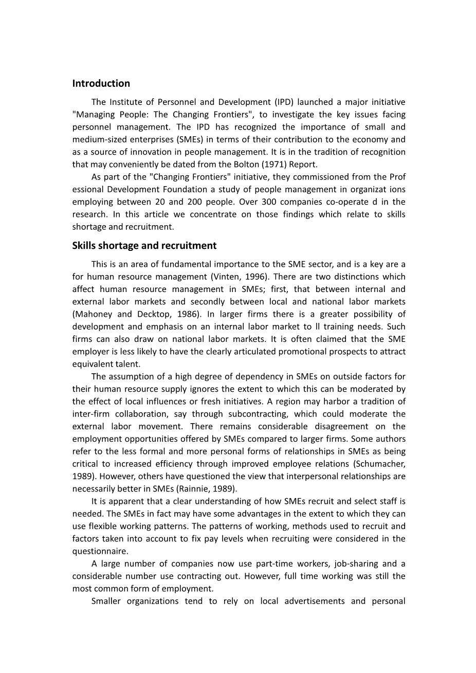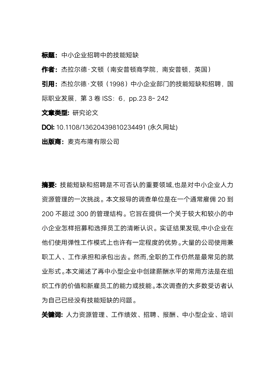 中小企业招聘中的技能短缺外文翻译资料 2023-02-14 09:42:14 英语原文共 8 页,剩余内容已隐藏,支付完成后下载完整资料 英语译文共 7 页,剩余内容已隐藏,支付完成后下载完整资料 资料编号:[442777],资料为PDF文档或Word文档,PDF文档可免费转换为Word 您需要先支付 30元 才能查看全部内容!立即支付 发小红书推广免费获取该资料资格。点击链接进入获取推广文案即可: Ai一键组稿 | 降AI率 | 降重复率 | 论文一键排版 PREVIOUS NEXT 您可能感兴趣的文章 社群电商平台的客户管理体系研究文献综述 腾讯游戏的发展战略分析文献综述 南通“开沙岛”度假村的商业模式研究开题报告 管理类专业学生接受国际教育影响因素的实证研究文献综述 居住环境与通勤时间对员工离职倾向的影响研究文献综述 了解互联网短视频分享的特点:基于对YouTube的测量研究外文翻译资料 连锁经营视角下餐饮行业的营销策略分析外文翻译资料 出租车行业的颠覆性变革:以UBER为例外文翻译资料 可口可乐公司财务分析外文翻译资料 是什么让财富增长?财富敏感财务报表分析外文翻译资料