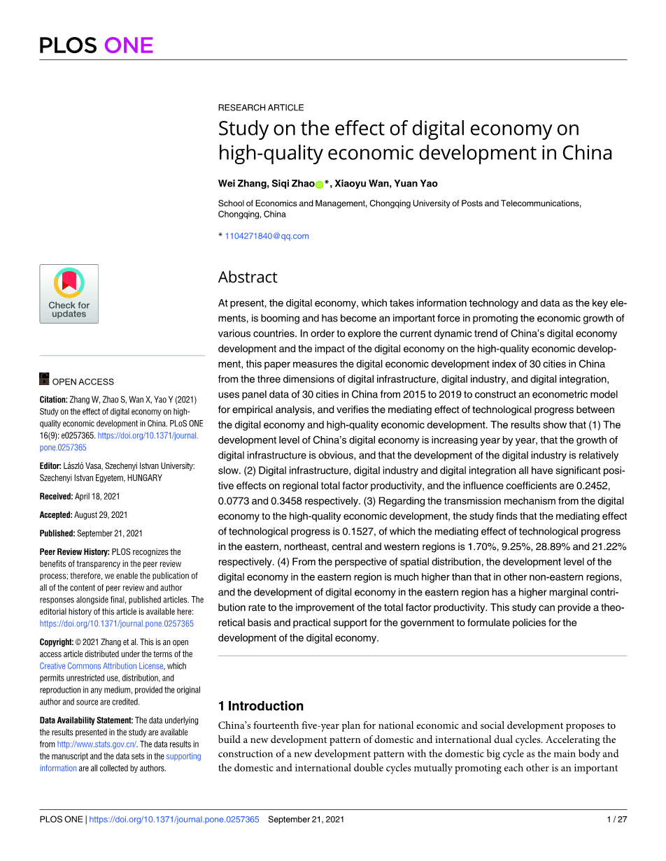 - 本文从宏观和微观两个层面探讨了数字经济对经济高质量发展的直接影响。从宏观上看,数字经济通过影响生产投入和产出效率来影响经济发展,具体表现为技术进步和技术溢出带来的要素投入增加,要素配置效率提高,全要素生产率提高[29]。对于发展中国家来说,数字化被认为是经济增长的主要驱动力。它提高了资本和劳动生产率,降低了交易成本,促进了各国融入全球市场体系[30,31]。对于发达国家来说,数字经济对经济发展质量的影响主要体现在促进可持续发展[32]和提高企业敏捷性[8]。2004年至2012年,数字经济是美国经济增长的主要动力。生产部门的自主研发投入和技术进步对全要素生产率(TFP)增长具有显著的正向影响。在经济合作与发展组织(OECD)的12个主要国家中,信息化对TFP的增长起到了重要的促进作用。欧盟15个发达经济体2009年至2018年的数据显示,国家和行业的数字政策可以显著促进经济增长[8]。此外,数字资产生产率的提高导致大规模生产系统的就业率急剧下降[36],这也对技术创新的发展产生了长期稳定的影响[37]。从微观上看,数字化制造技术提高了企业的竞争力,提高了公司的绩效[38],有效地促进了电子政务的发展[39],帮助企业实现了循环经济的商业模式[40]。总体而言,尽管信息技术和数字技术发展迅速,但以信息数据和云计算为代表的数字经济并没有在经济发展中发挥最大的作用。