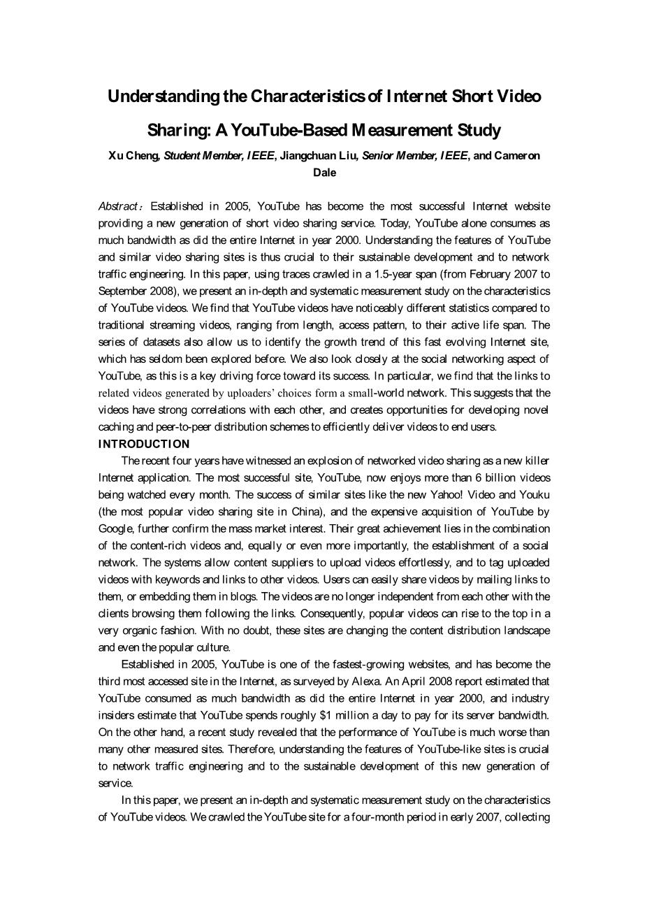 成立于2005年的YouTube已经成为最成功的互联网网站,提供了新一代的短视频分享服务。今天,仅YouTube就消耗了2000年整个互联网的带宽。因此,了解YouTube和类似视频分享网站的特点对它们的可持续发展和网络流量工程至关重要。本文利用1.5年的时间跨度(2007年2月至2008年9月)对YouTube视频的特征进行了深入系统的测量研究。我们发现,与传统的流媒体视频相比,YouTube视频的统计数据有明显的不同,从长度、访问模式到活跃的生命周期。这一系列的数据集也让我们能够确定这个快速发展的互联网站点的增长趋势,这是以前很少有人探索过的。我们也密切关注YouTube的社交网络方面,因为这是其成功的关键驱动力。特别地,我们发现上传者的选择生成的相关vide操作系统的链接形成了一个小世界网络,这表明这些视频彼此之间有很强的相关性,并为开发新的缓存和对等分发方案创造了机会,从而有效地将视频交付给最终用户。