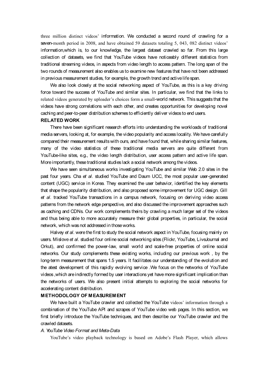 YouTube视频格式和元数据: YouTube的视频播放技术是基于Adobe的Flash Player, Flash Player允许YouTube播放与成熟的视频播放技术(如Windows Media Player、QuickTime和Realplayer)质量相当的视频。YouTube接受多种格式的上传视频,上传后转换成. flv (Adobe Flash Video)格式。众所周知,使用统一的易于播放的格式对YouTube的成功至关重要。在我们的测量过程中,YouTube使用了H.263视频编解码器,并在2008年底推出了使用H.264编解码器的“高质量”格式,以提高观看质量。然而,我们的测量和结论在很大程度上独立于这些变化。